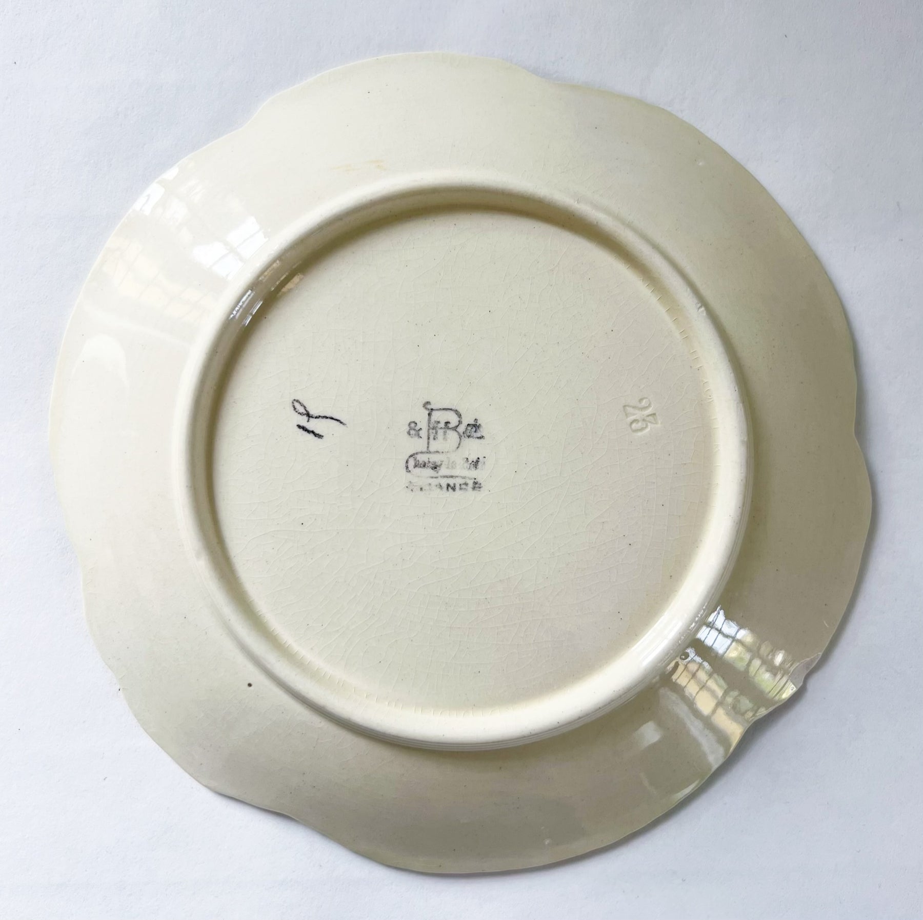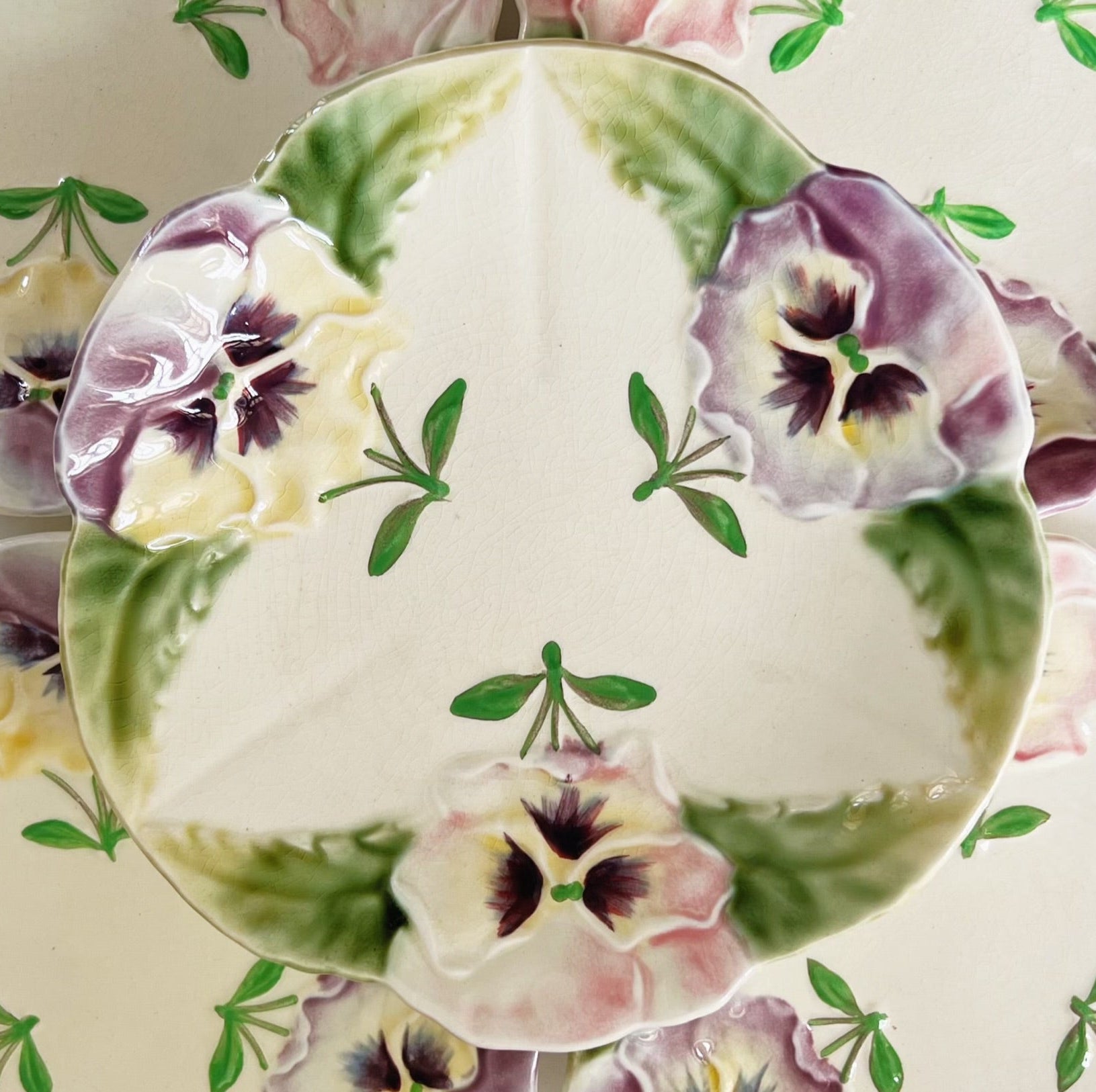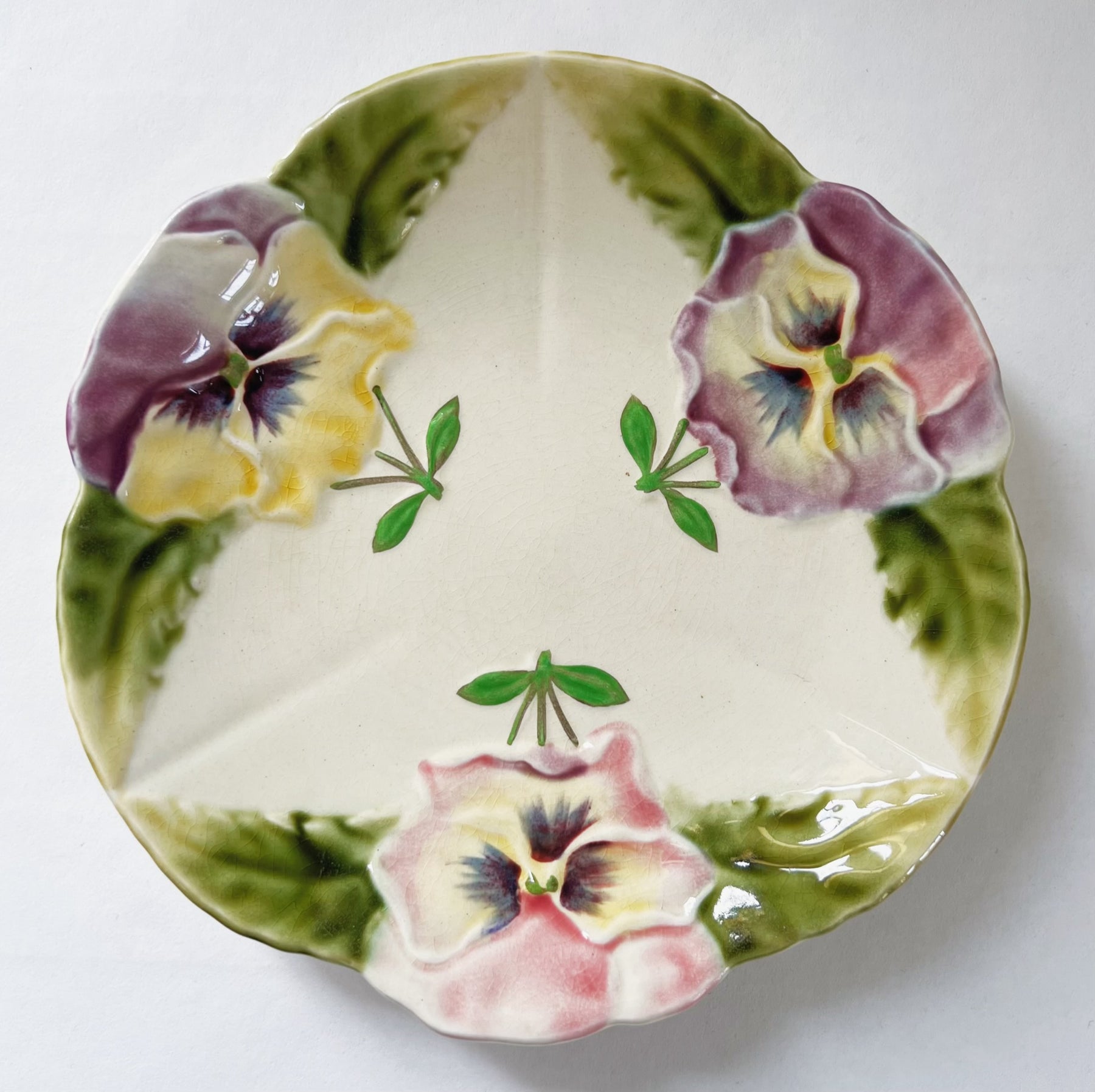 Smuk gammel fransk barbotine frokost/desserttallerken med motiv af stedmoderblomst. Tallerkenen er fra første halvdel af 1900 tallet.