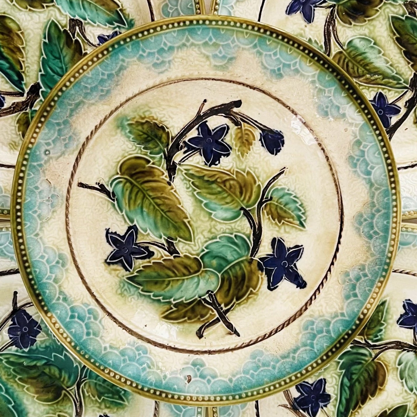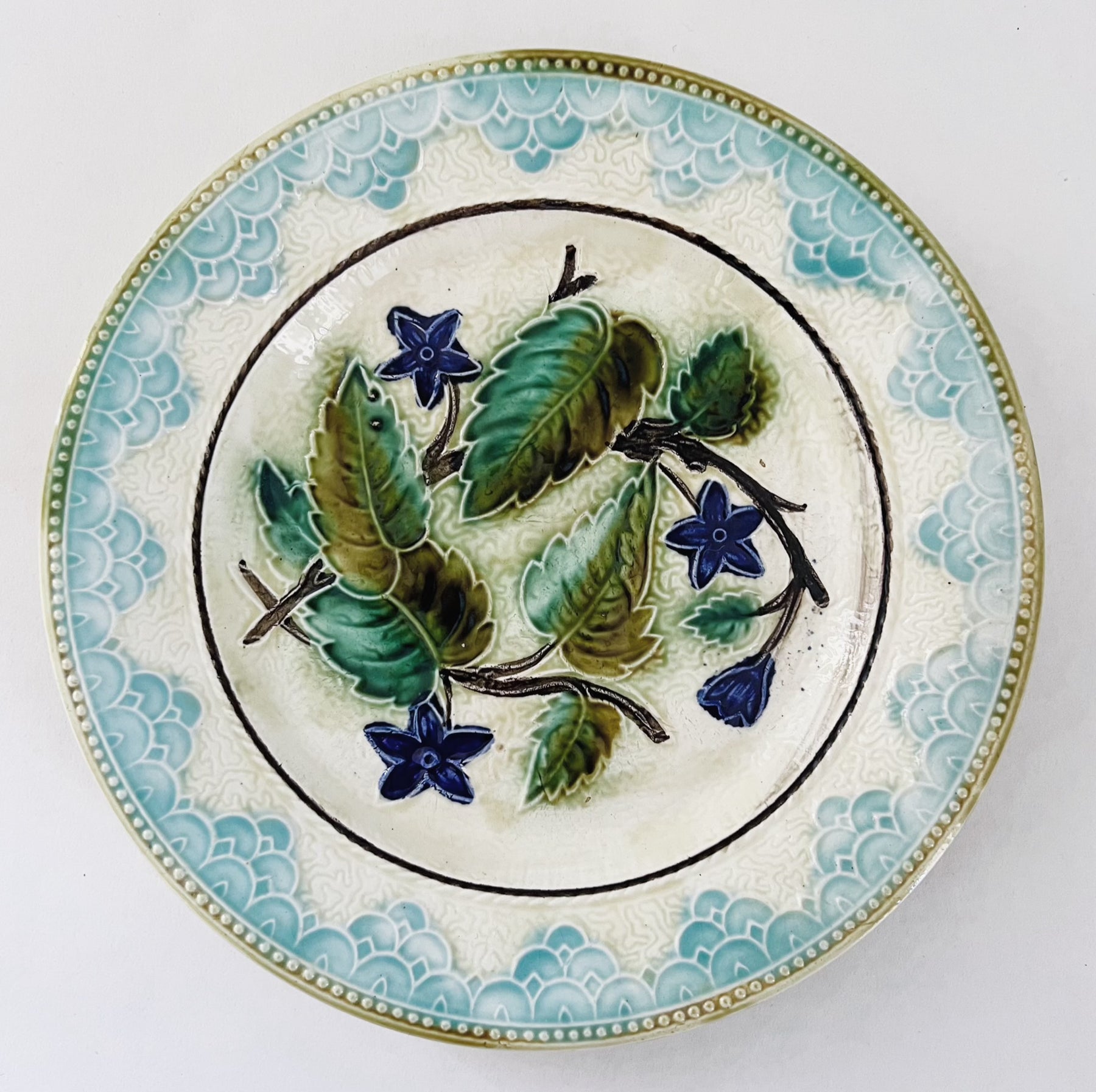 Smuk gammel fransk barbotine kage-/desserttallerken. Tallerkenen er fra starten af 1900 tallet.