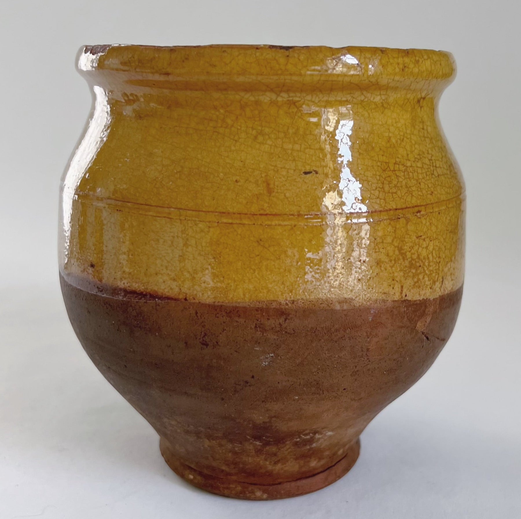Smuk mindre okkergul-glaseret krukke med flot grønt glasurløb. Krukken er fra sydfrankrig hvor den bl.a. blevet brugt til opbevaring af madvarer. Krukken er fra omkring år 1900.
