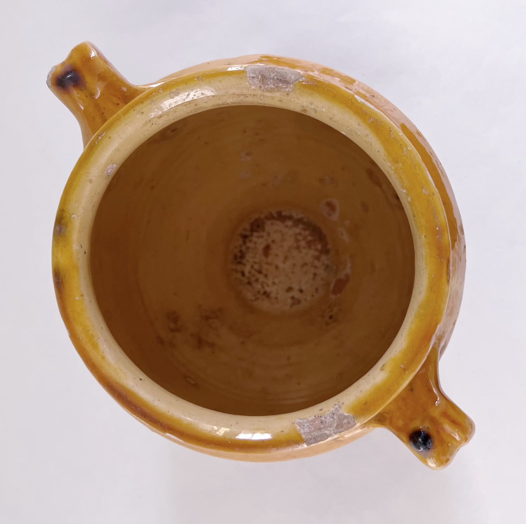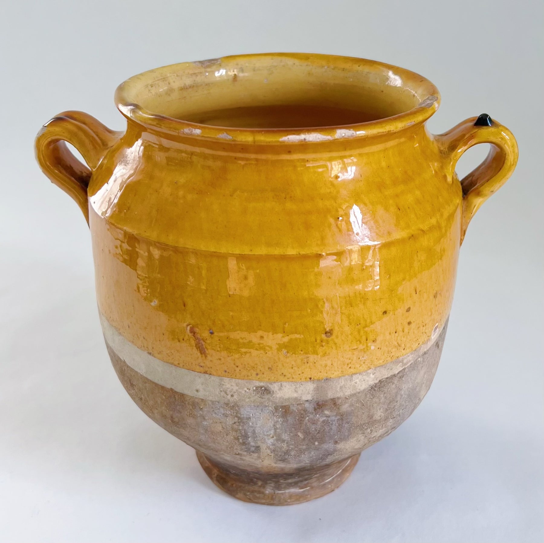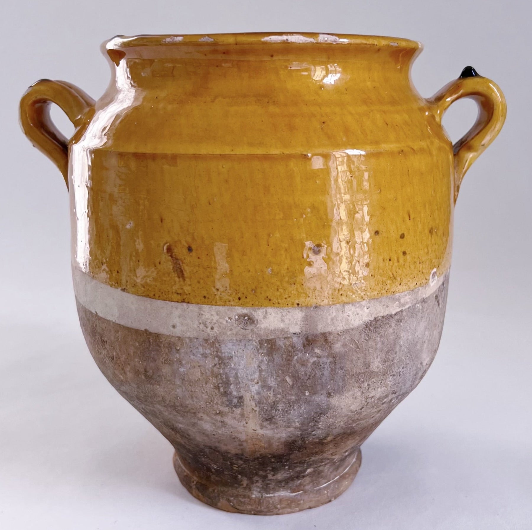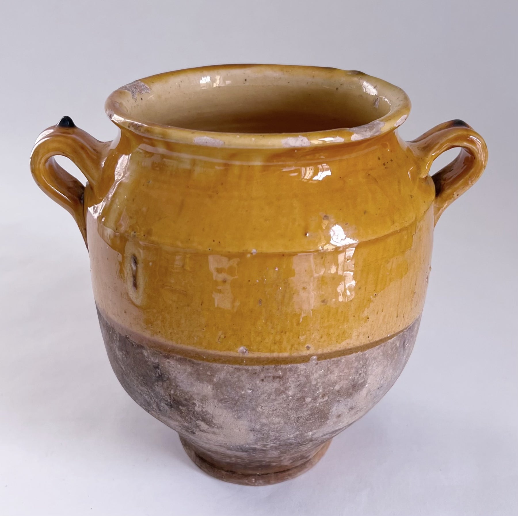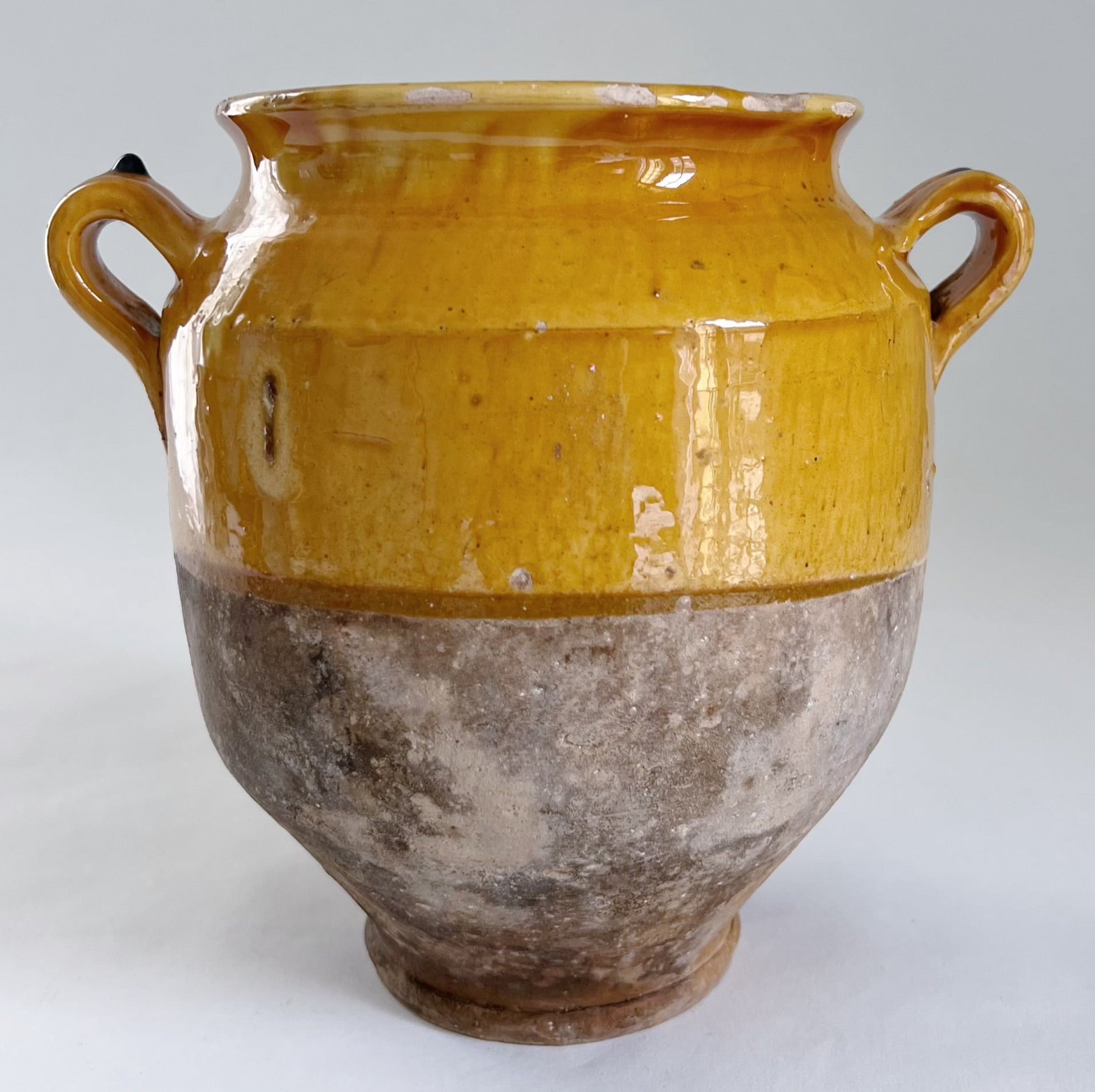 Flot okkergul glaseret krukke fra sydfrankrig hvor den bl.a. blevet brugt til opbevaring af andefedt og andre madvarer. Krukken er fra omkring år 1900.