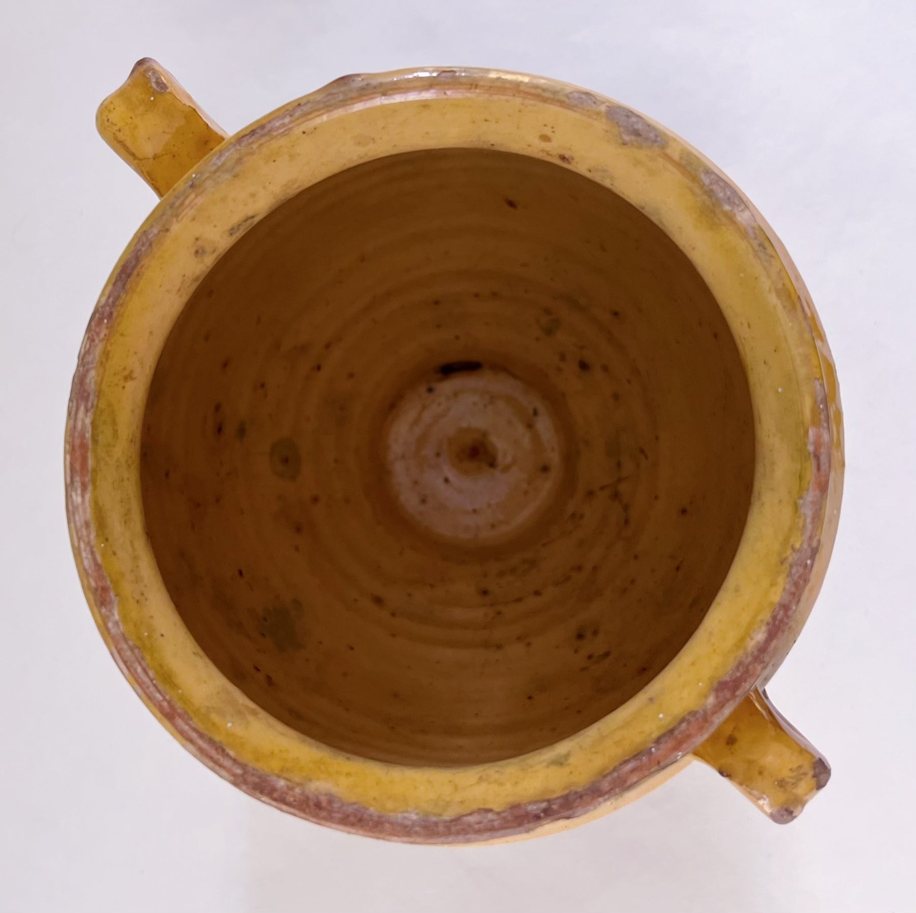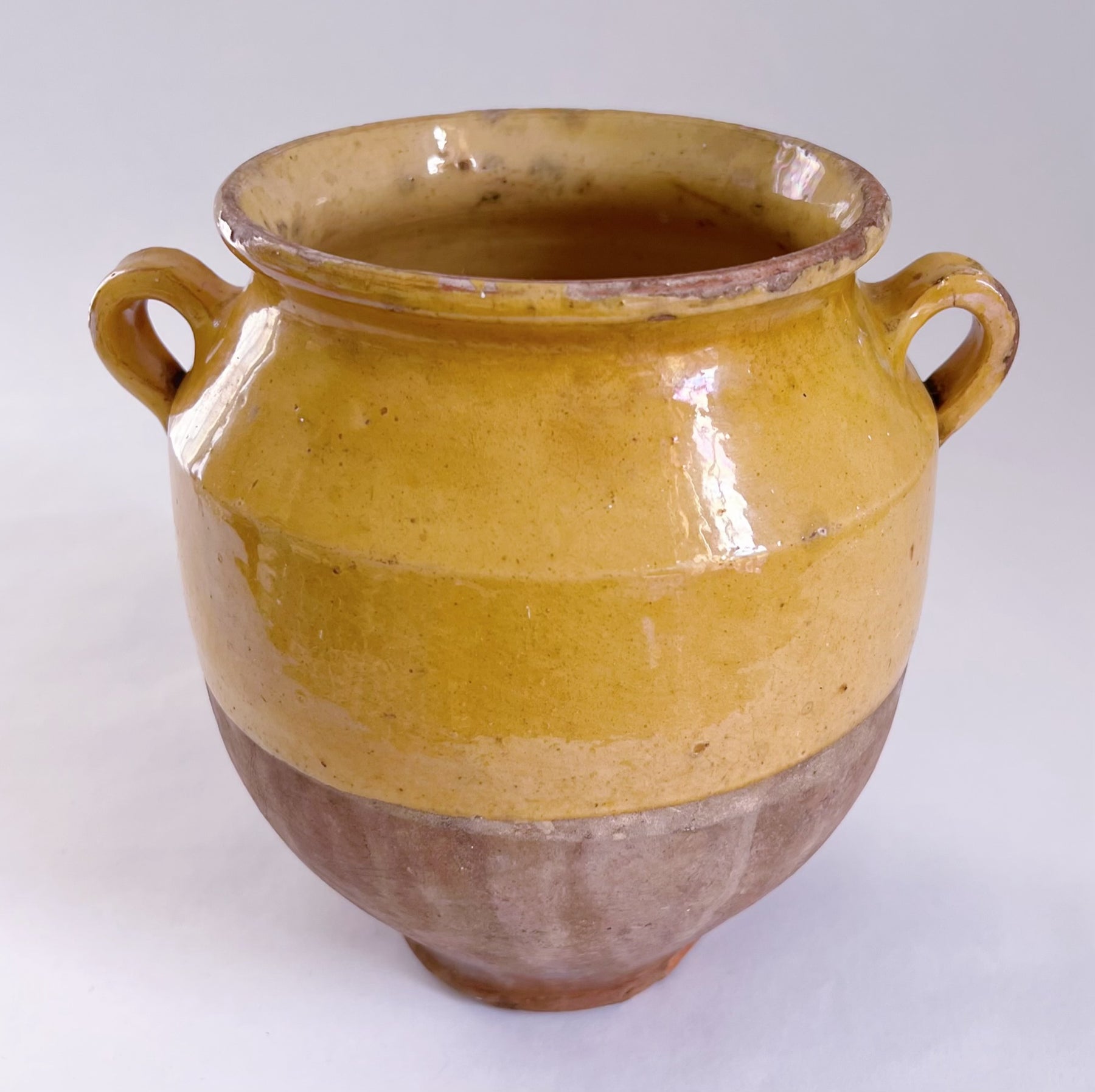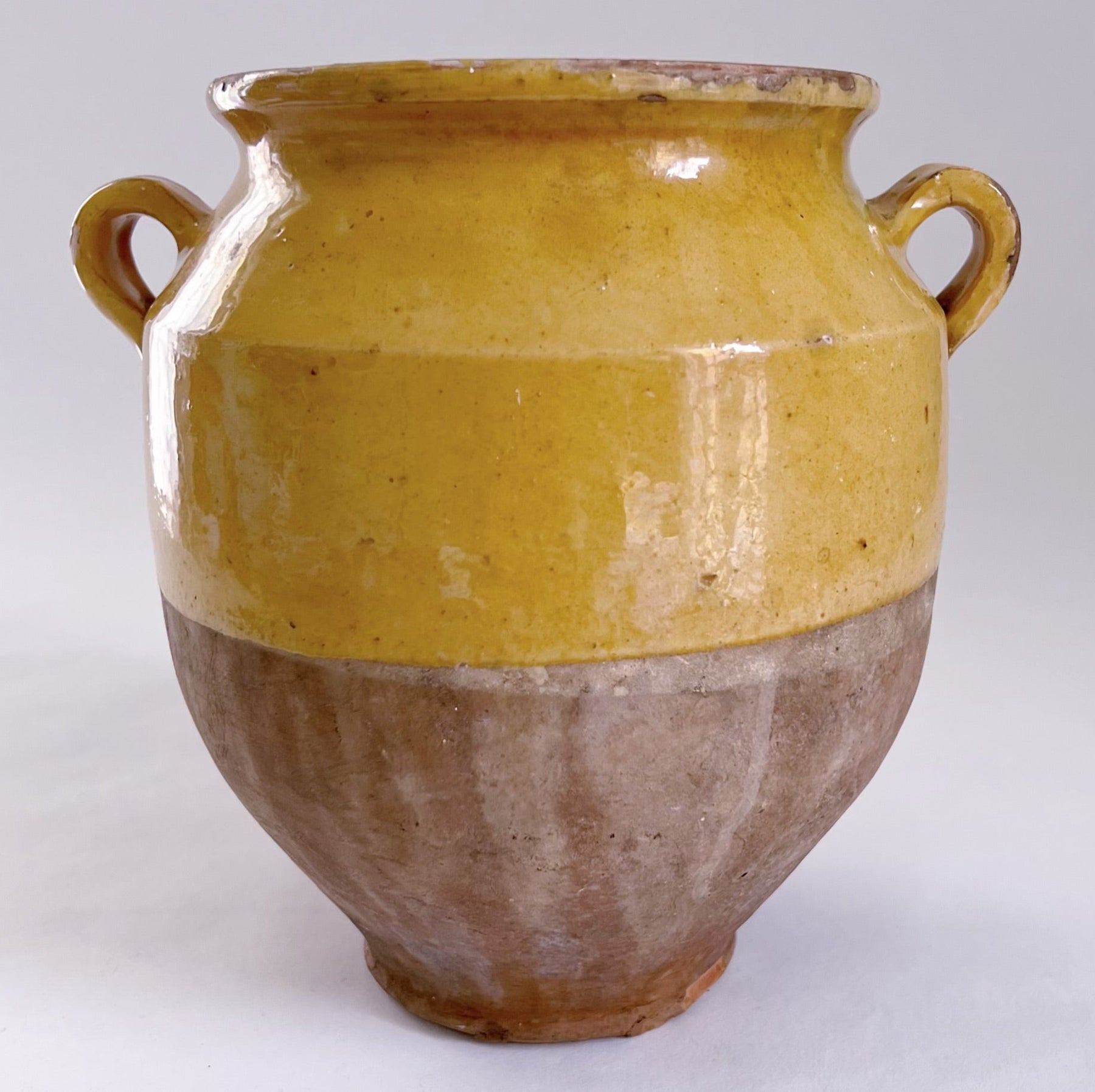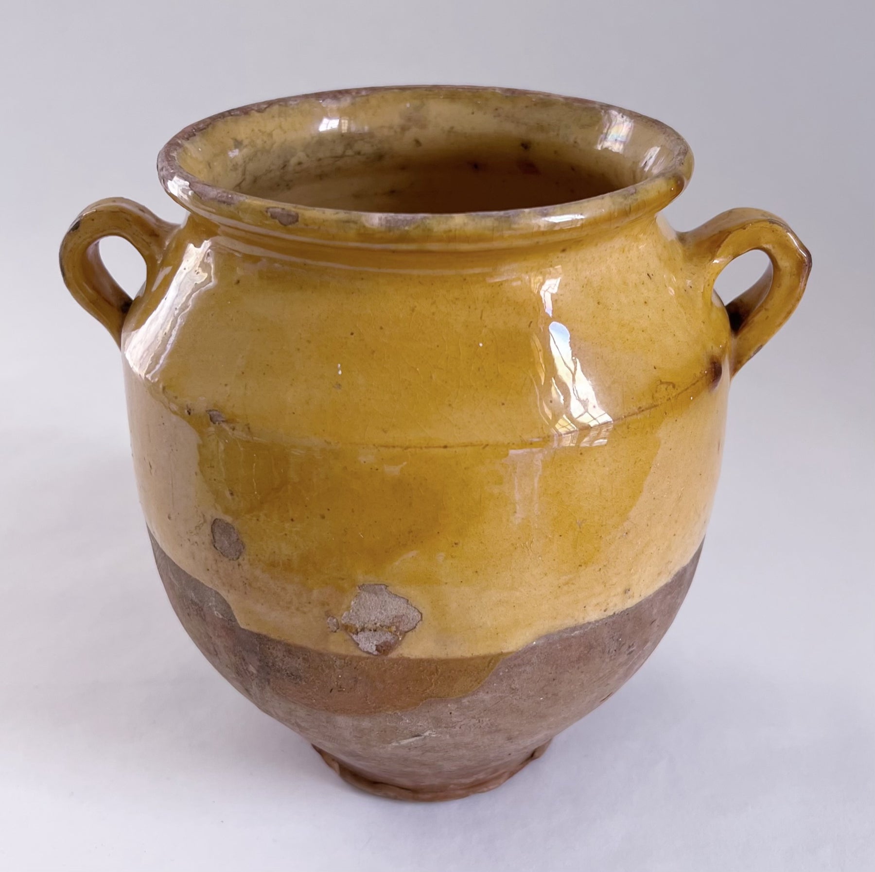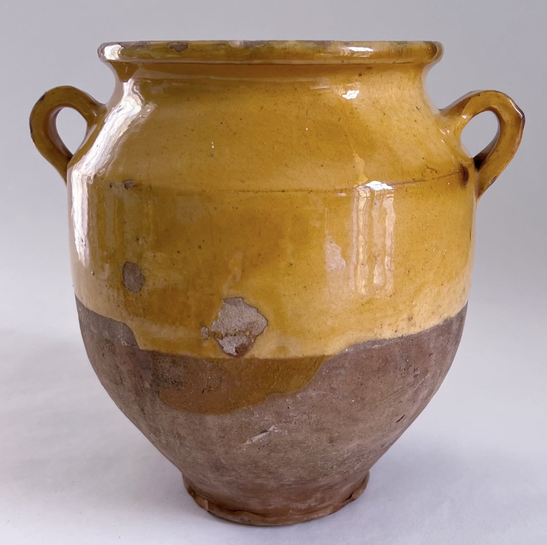 Flot okkergul glaseret krukke fra sydfrankrig hvor den bl.a. blevet brugt til opbevaring af andefedt og andre madvarer. Krukken er fra omkring år 1900.
