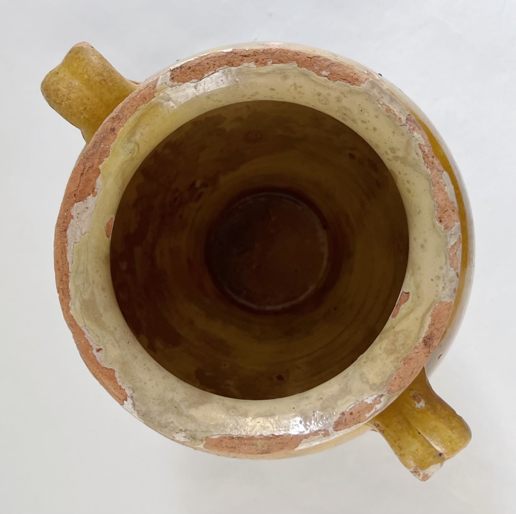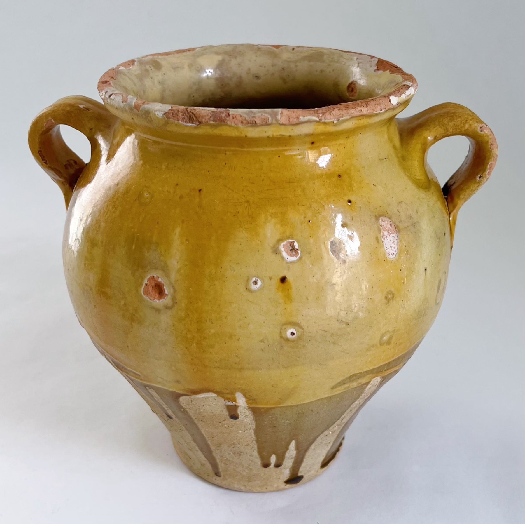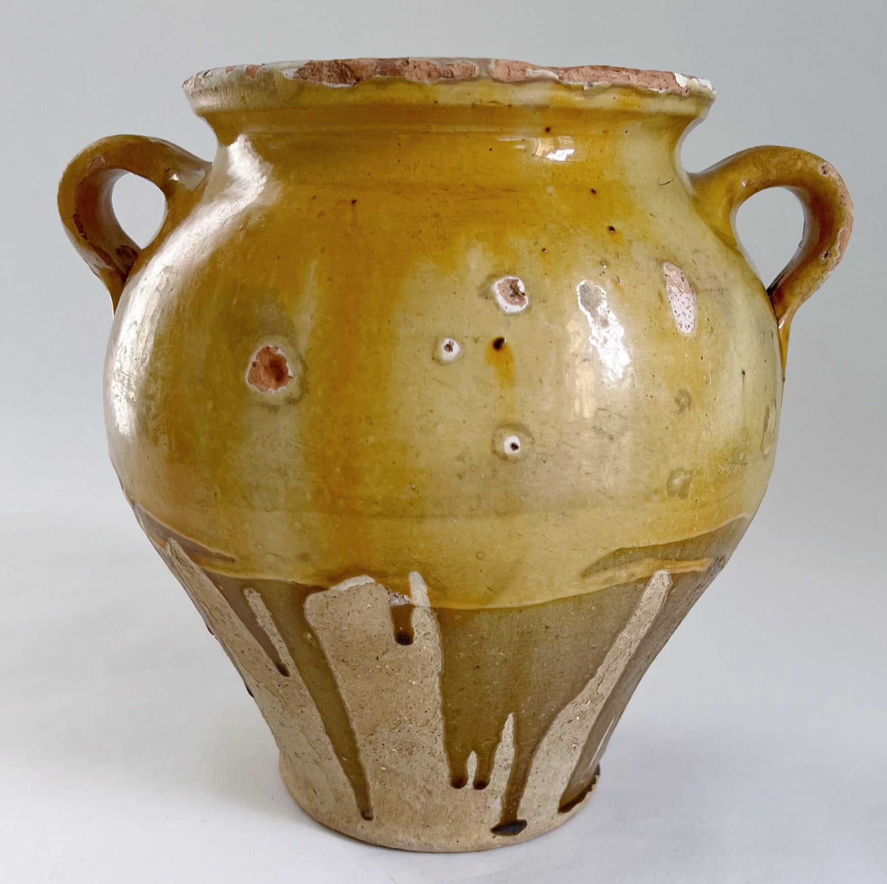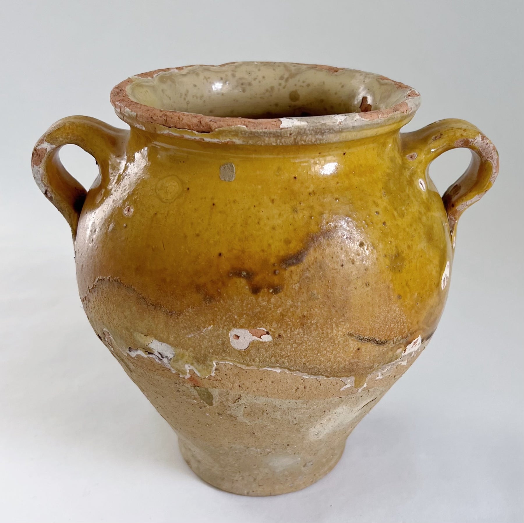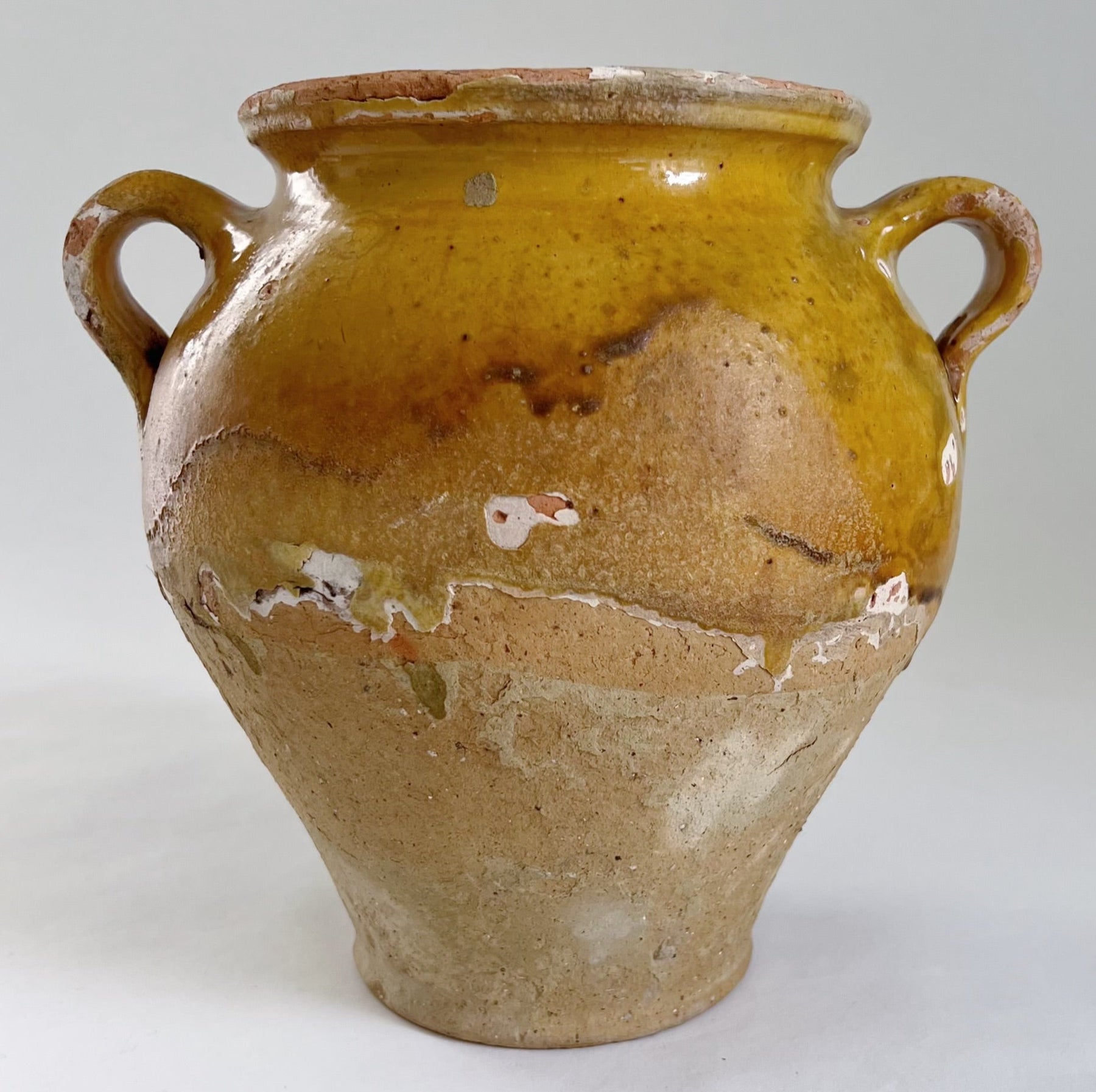 Meget flot gul-glaseret krukke fra sydfrankrig, hvor den bl.a. blevet brugt til opbevaring af andefedt og andre madvarer. Krukken er fra omkring år 1900.
