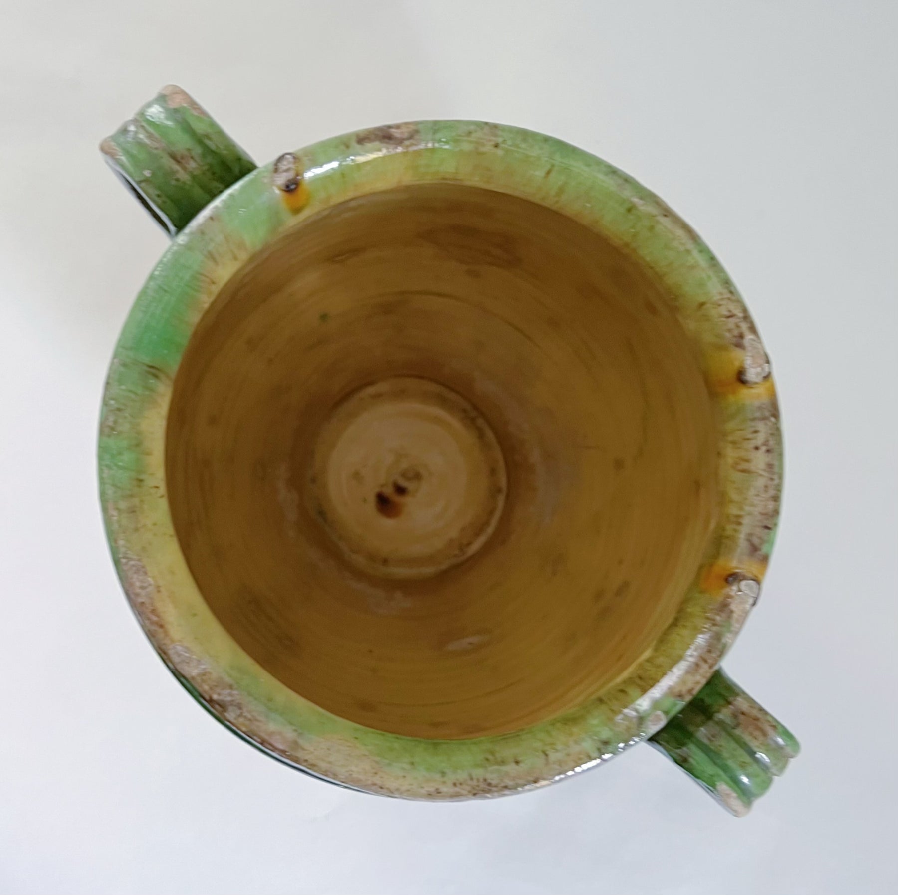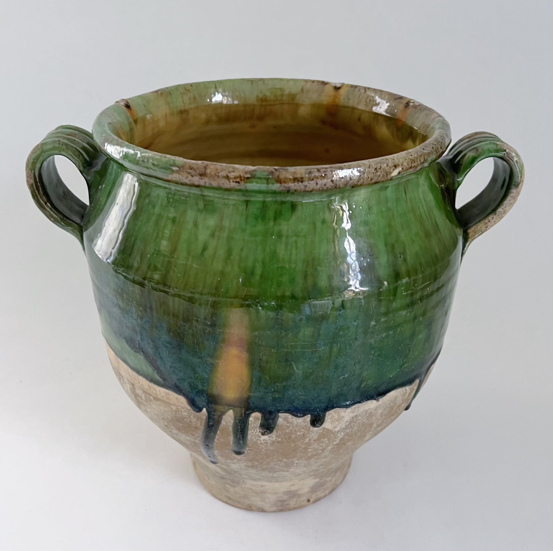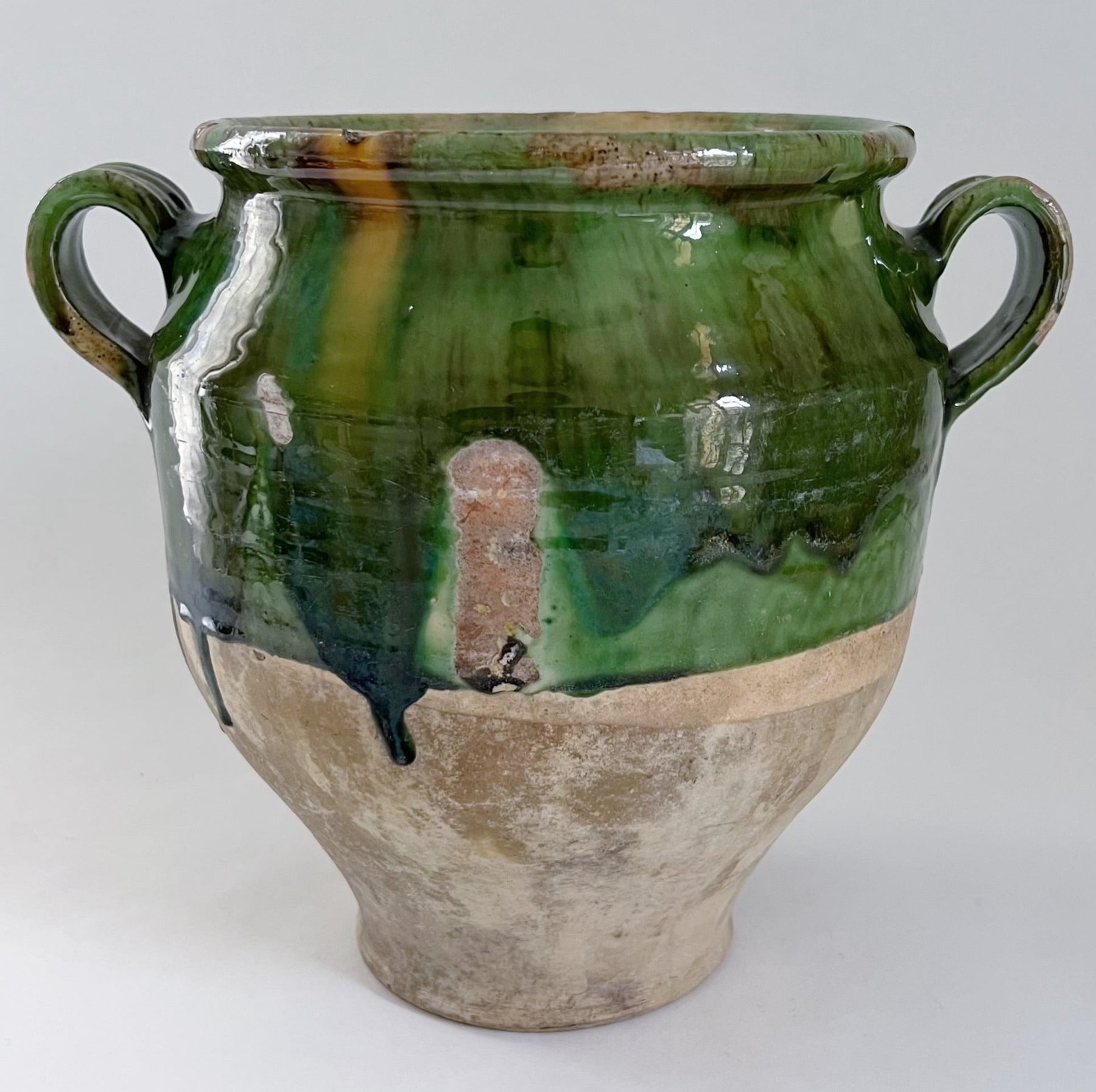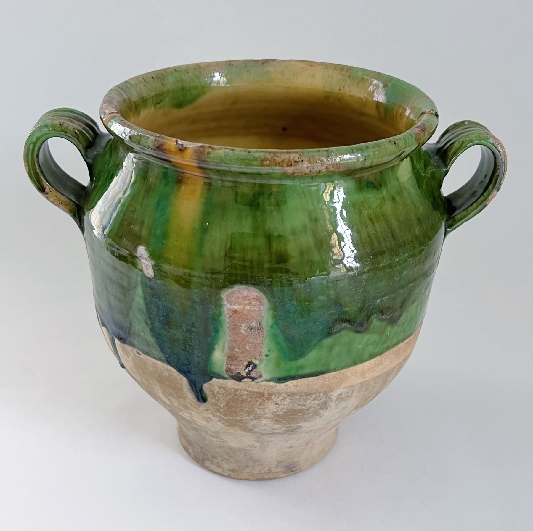 Meget flot grøn-glaseret krukke fra sydfrankrig hvor den bl.a. blevet brugt til opbevaring af madvarer. Krukken er fra omkring år 1900.