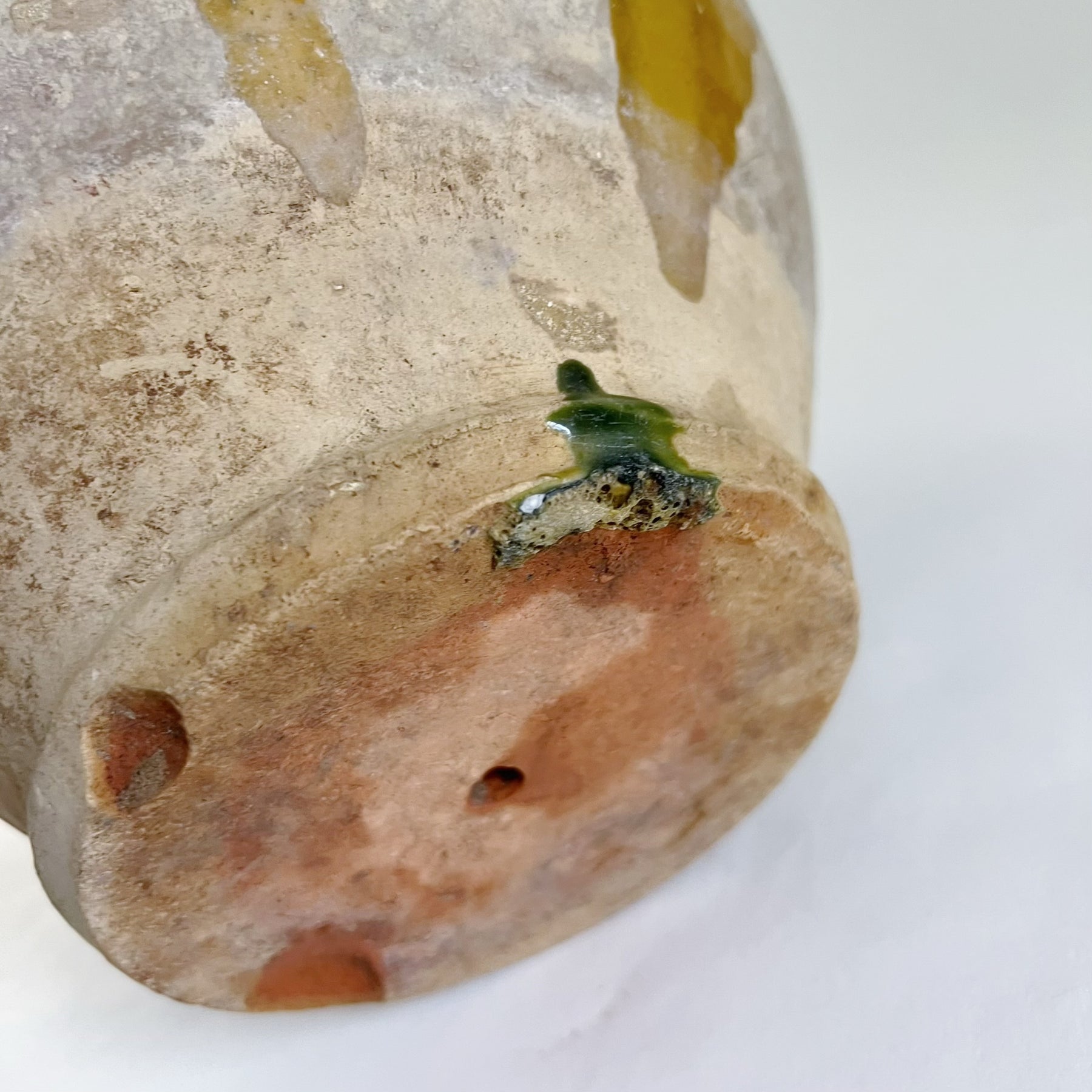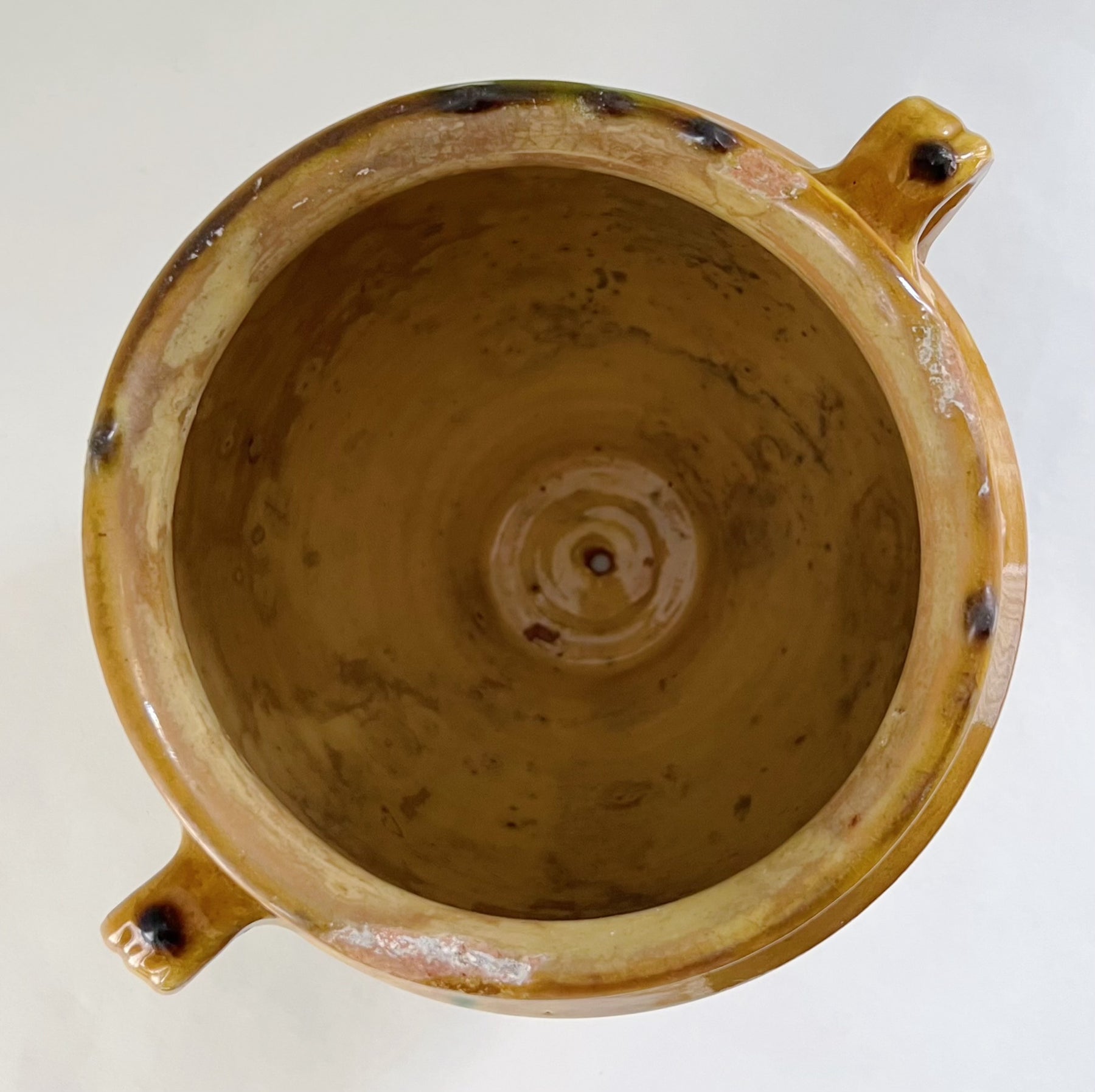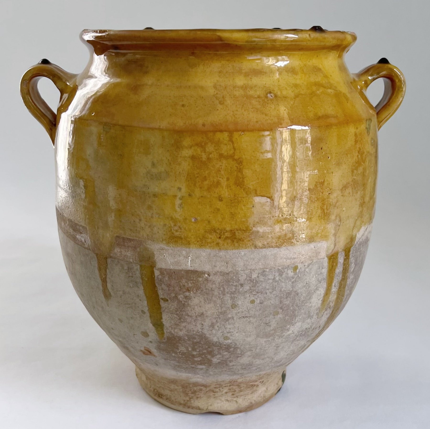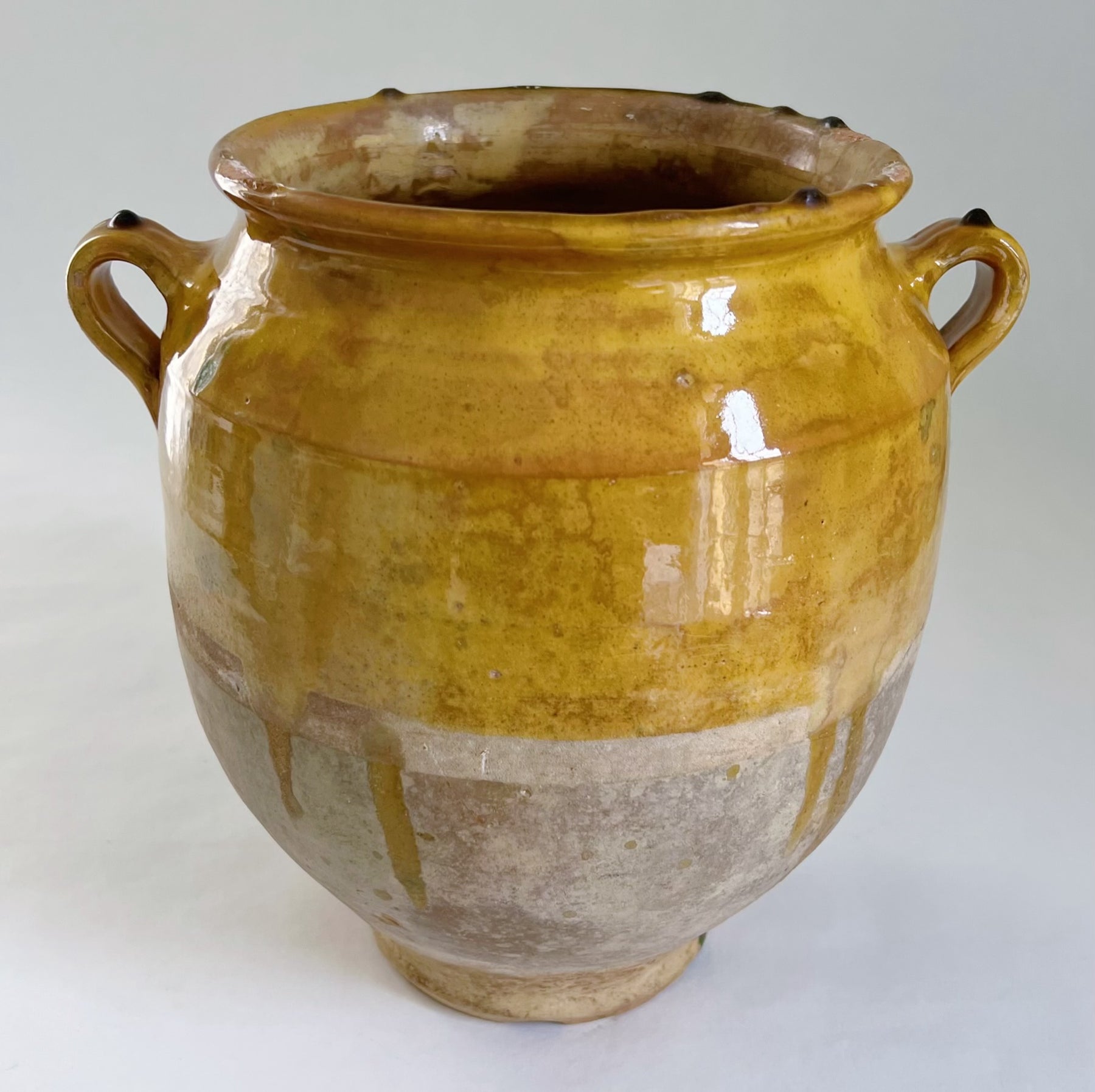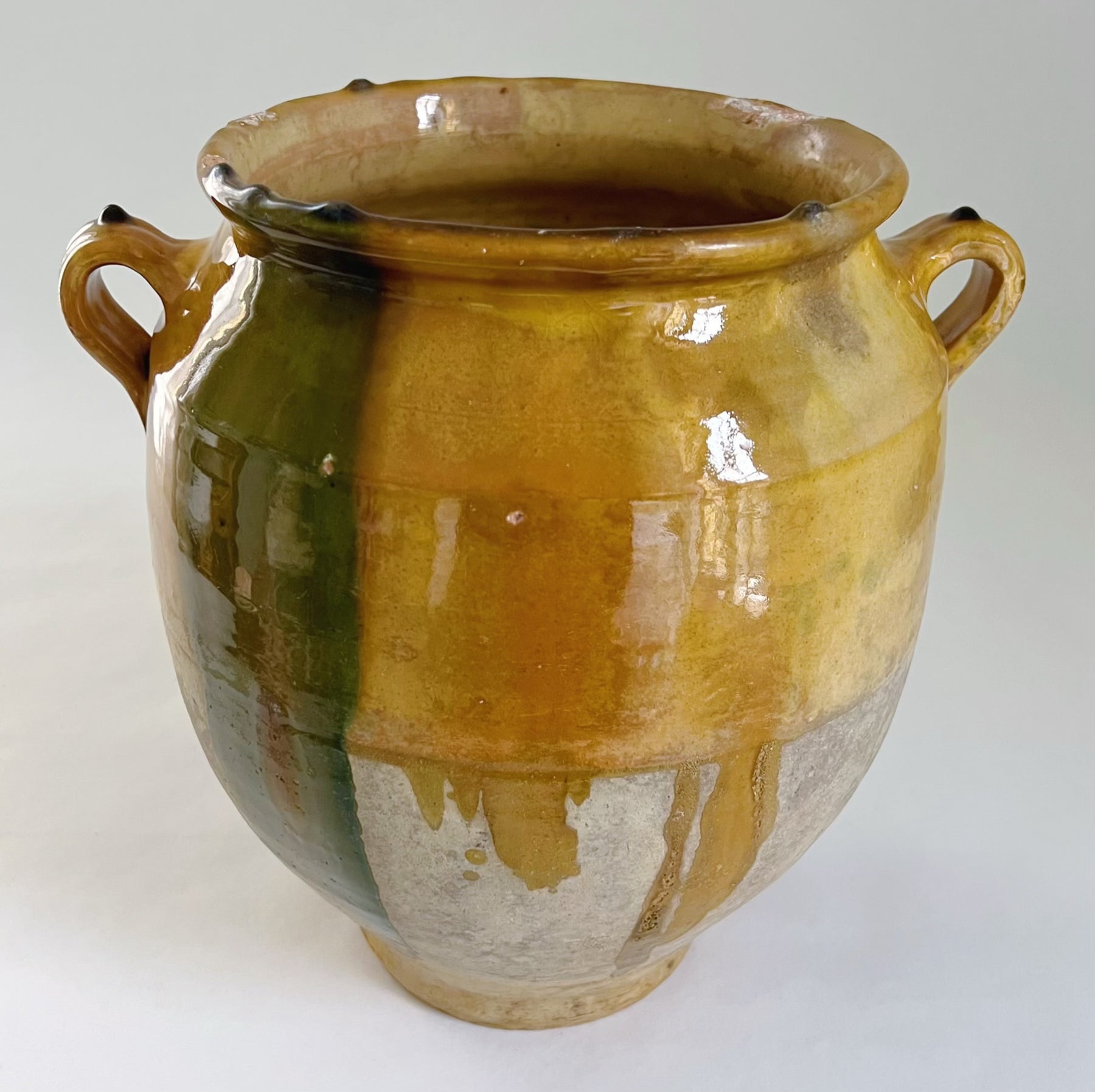 Meget smuk sydfransk okkergul glaseret krukke med flotte sjældne grønne glasurløb. Krukken er bl.a. blevet brugt til opbevaring af madvarer. Krukken er fra omkring år 1900. Der er drønhuller i bunden som gør man kan plante i den.