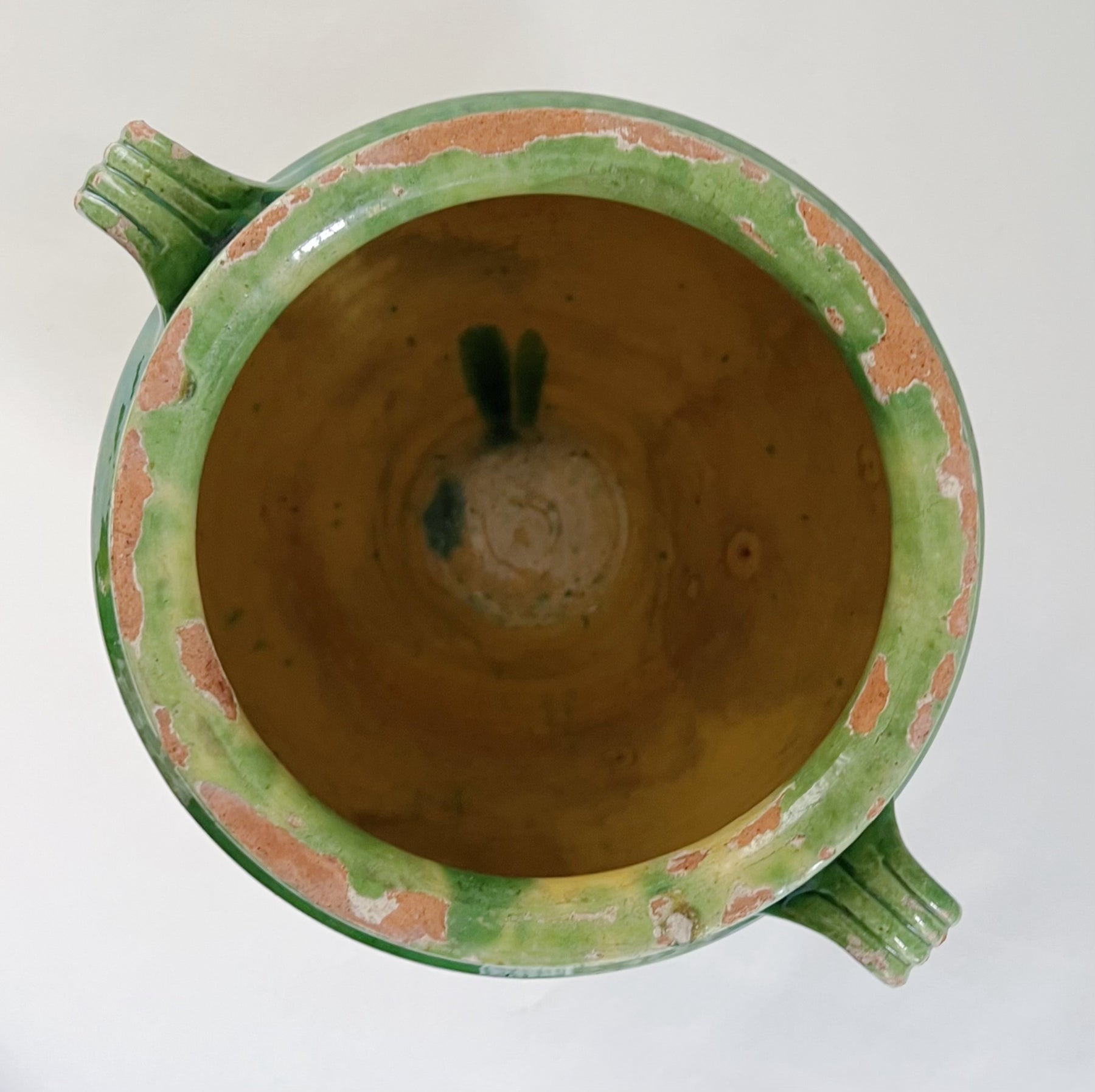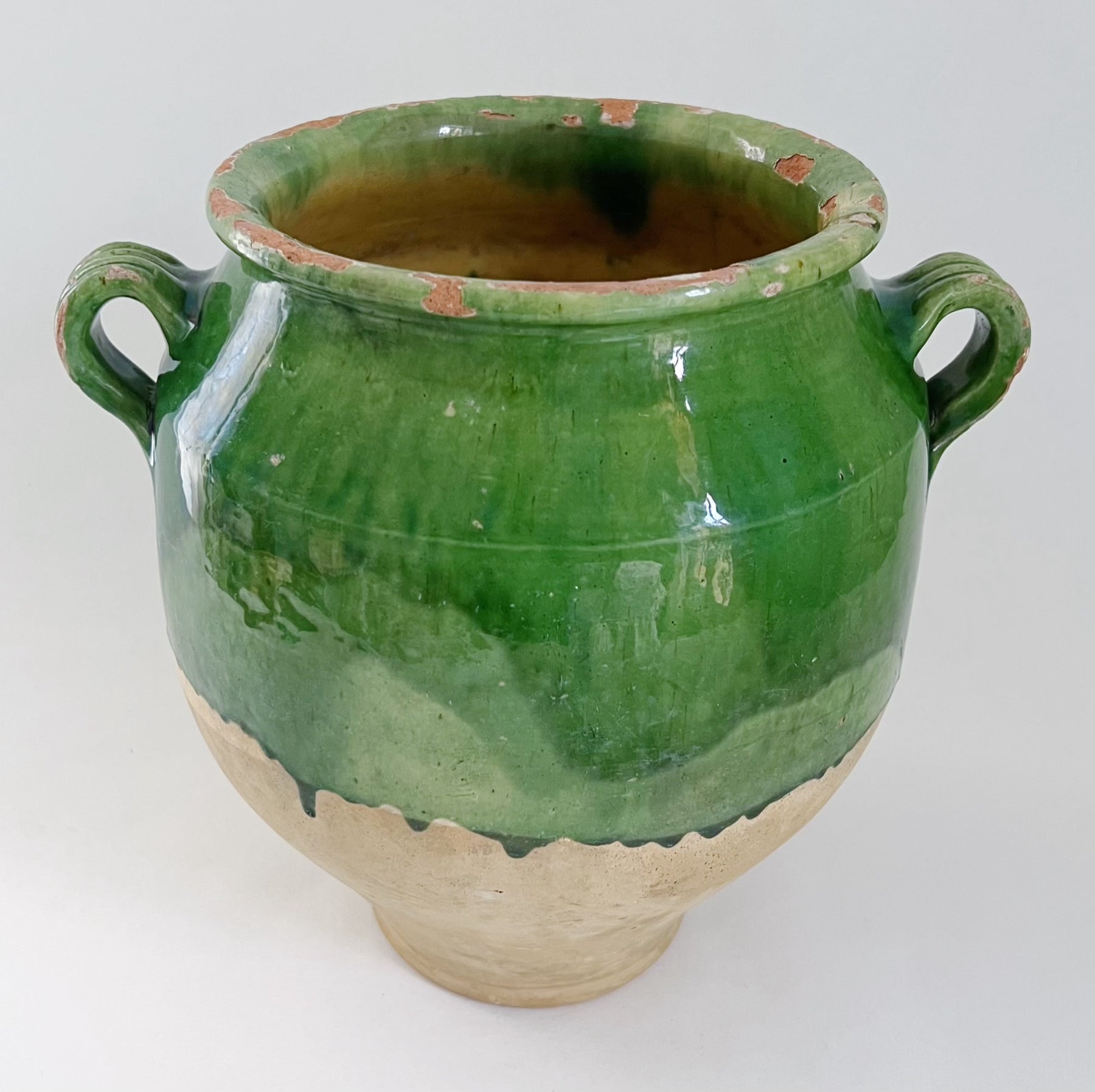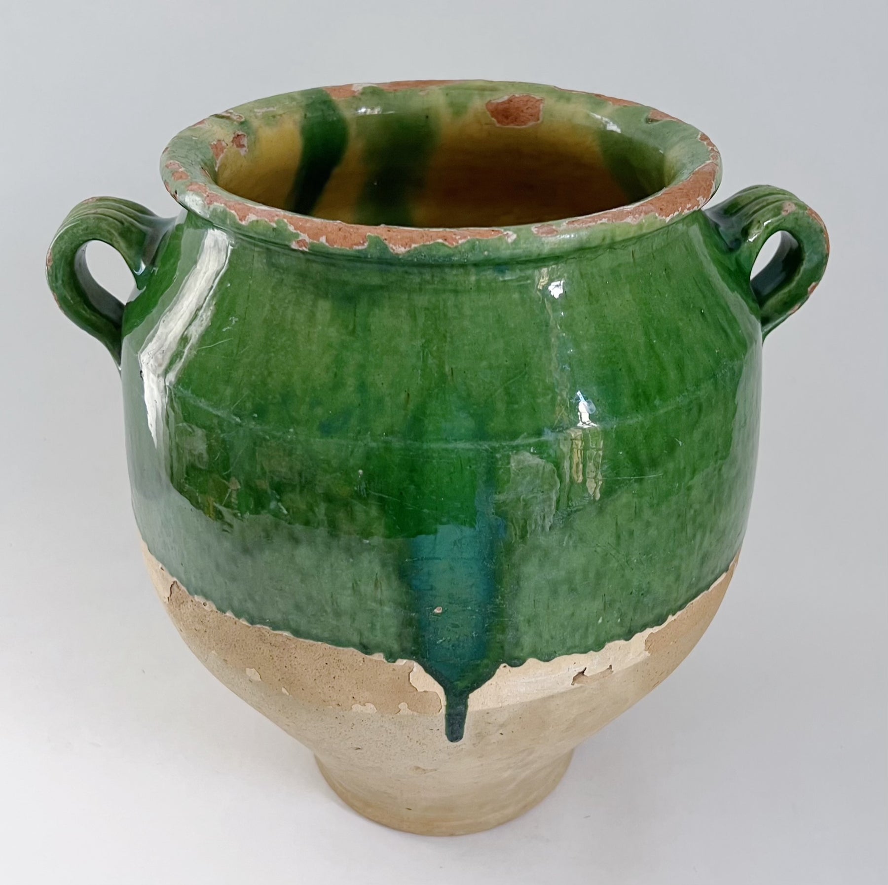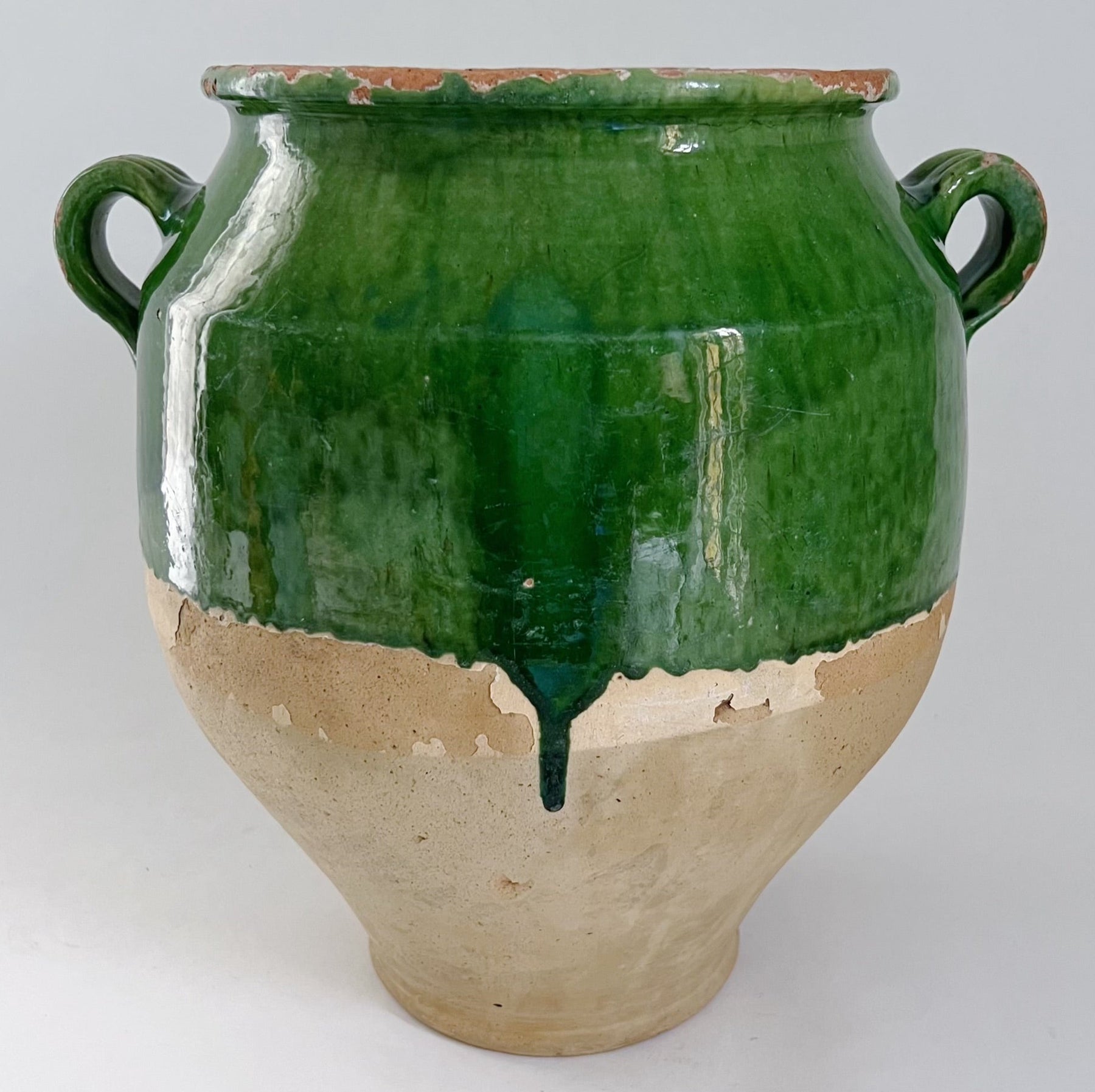 Meget smuk stor grøn-glaseret krukke fra sydfrankrig, hvor den bl.a. blevet brugt til opbevaring af andefedt og andre madvarer. Krukken er fra omkring år 1900. Giver utrolig stemning!