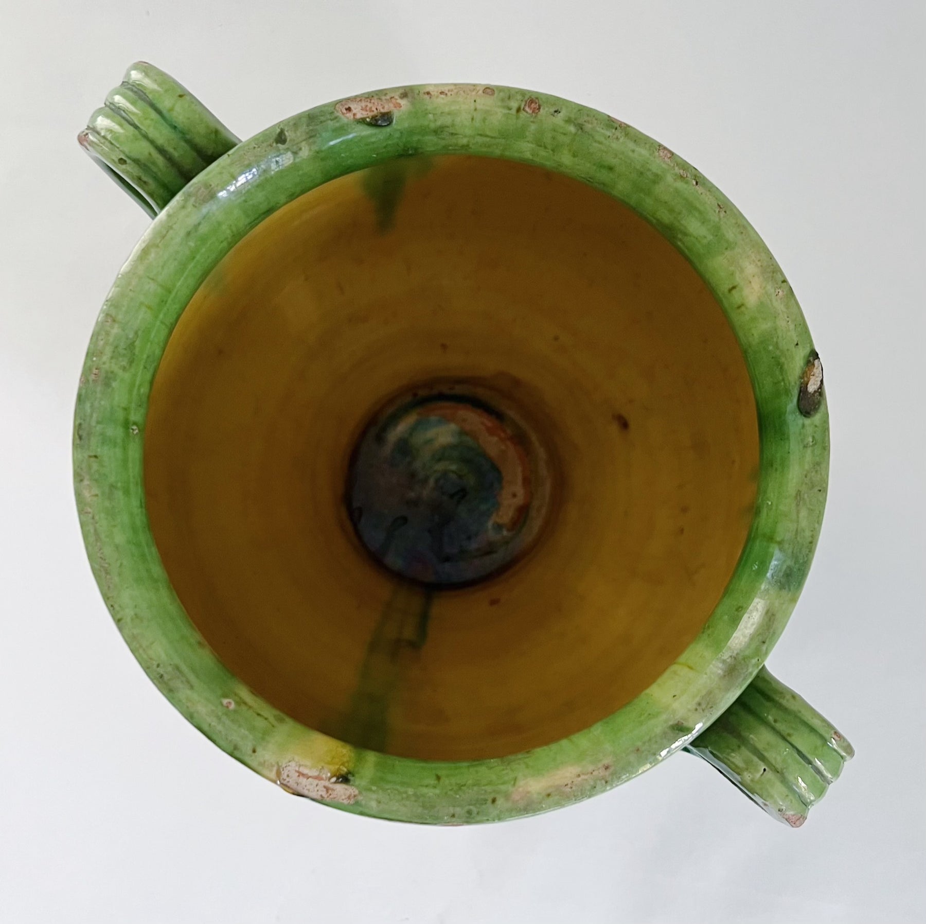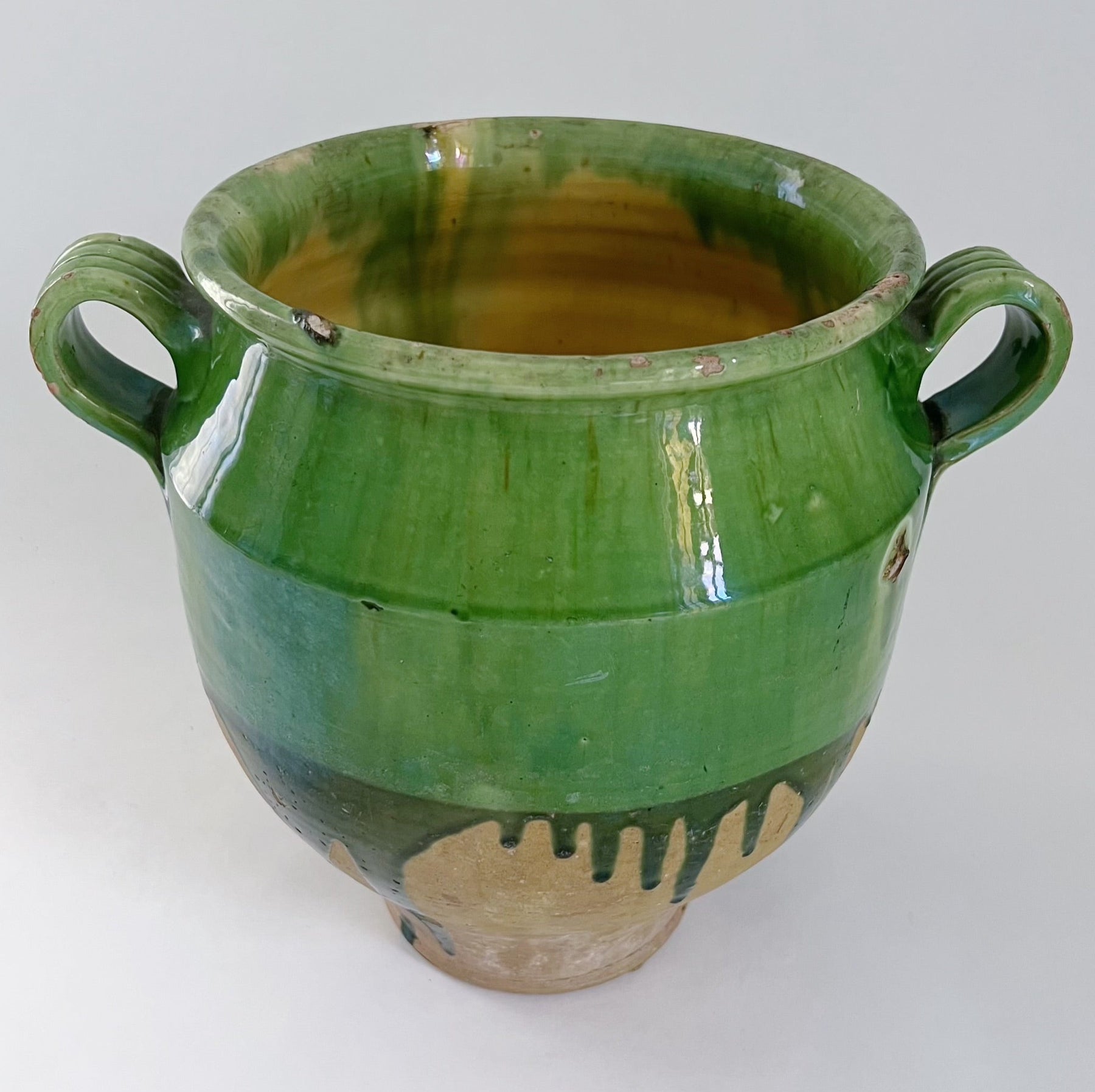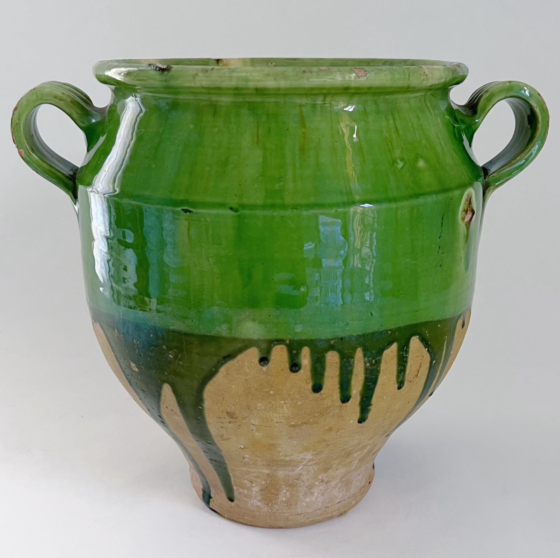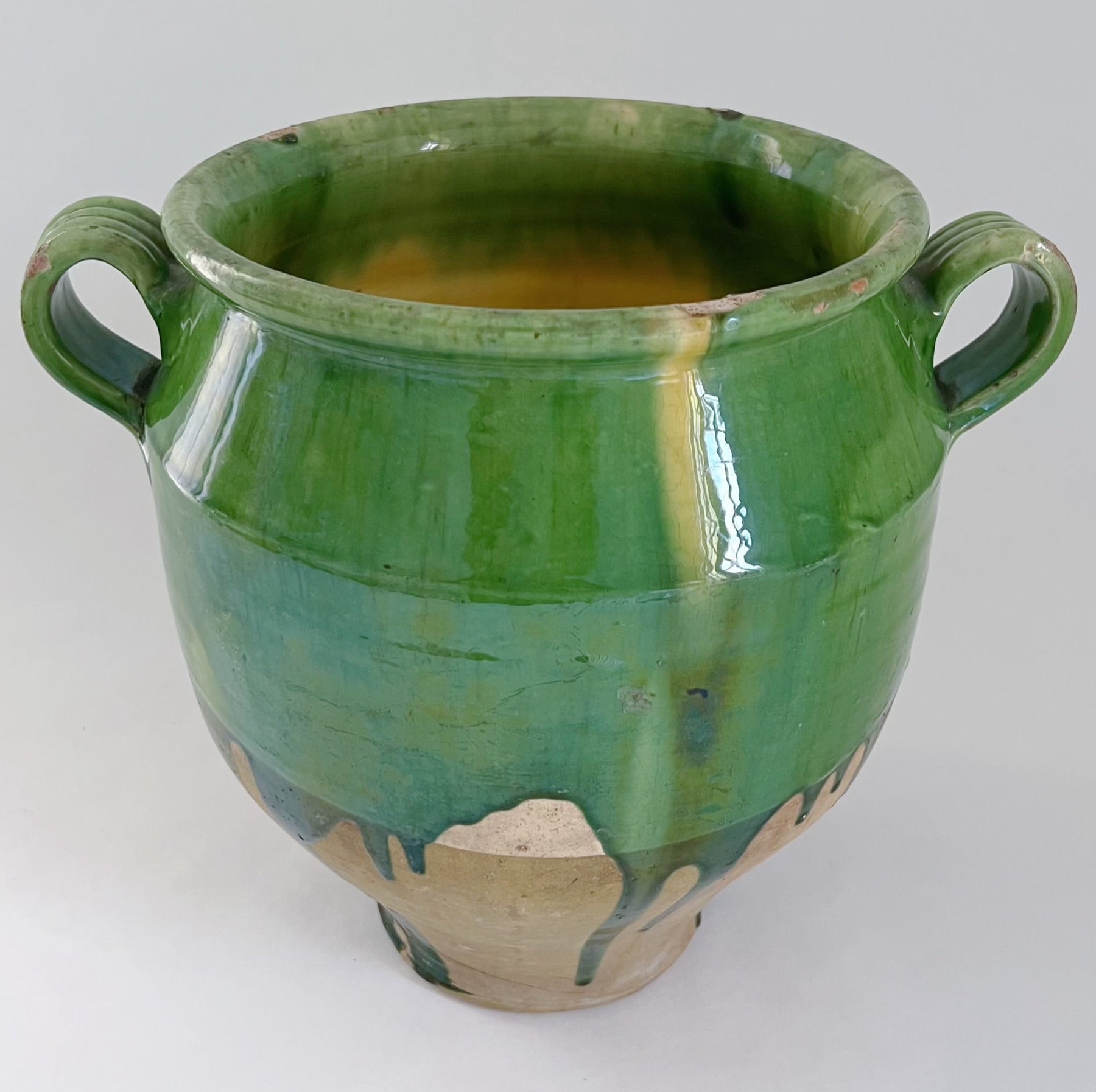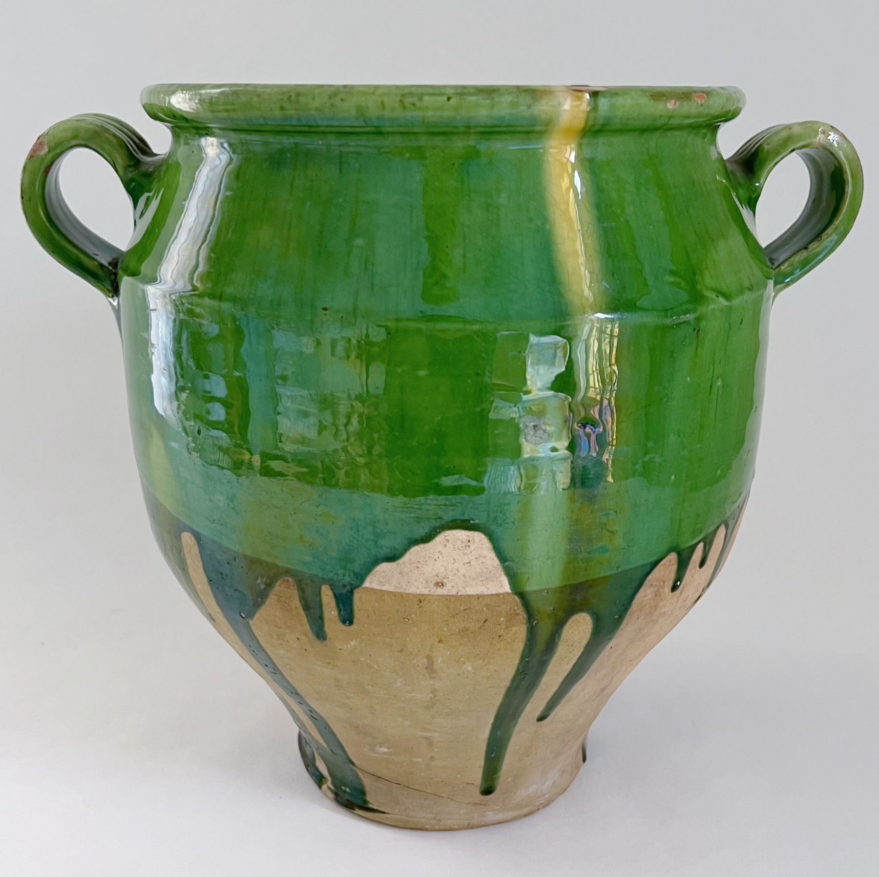 Meget smuk stor grøn-glaseret krukke fra sydfrankrig, hvor den bl.a. blevet brugt til opbevaring af andefedt og andre madvarer. Krukken er fra omkring år 1900. Giver utrolig stemning. I sjælden god stand!