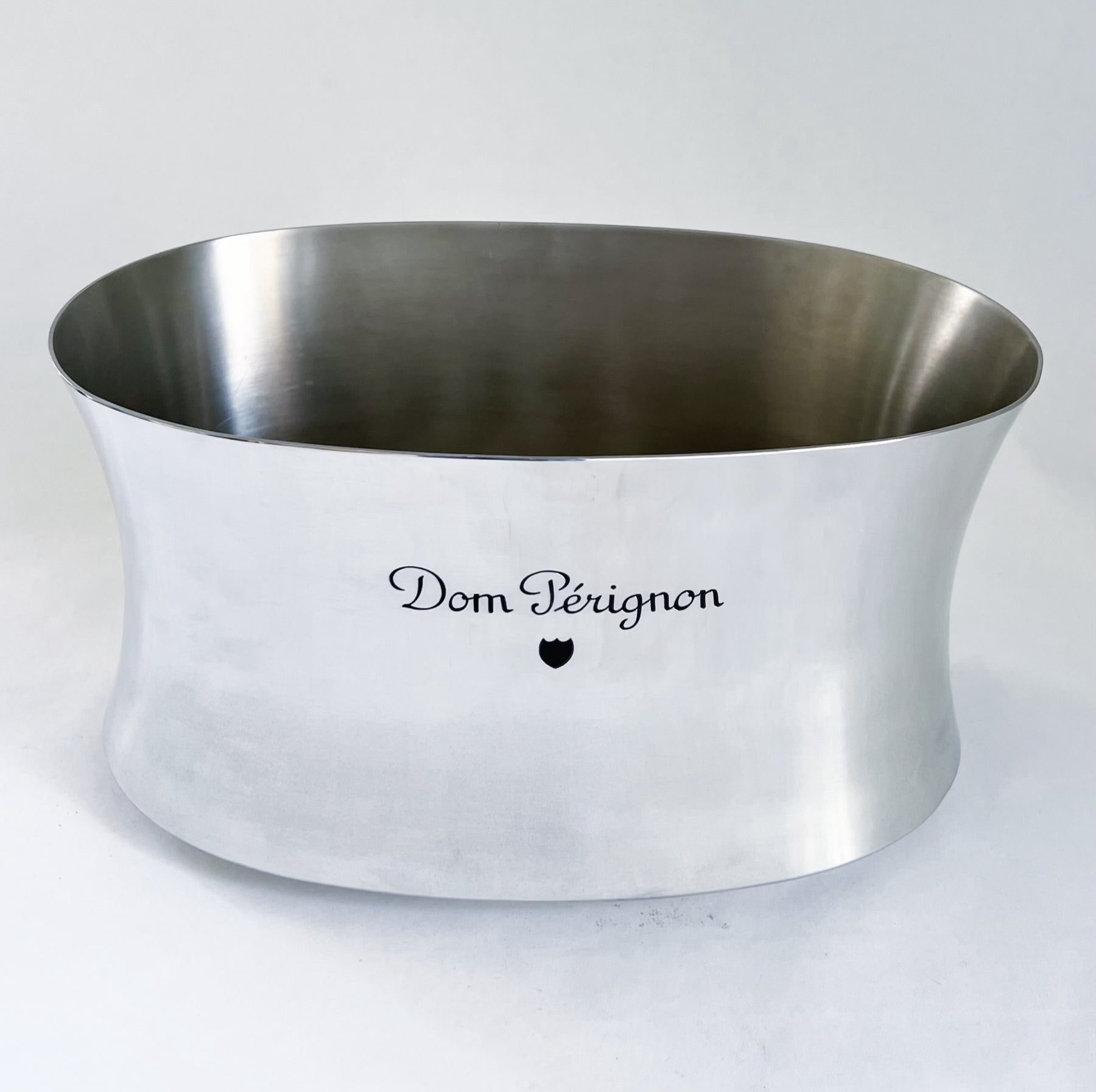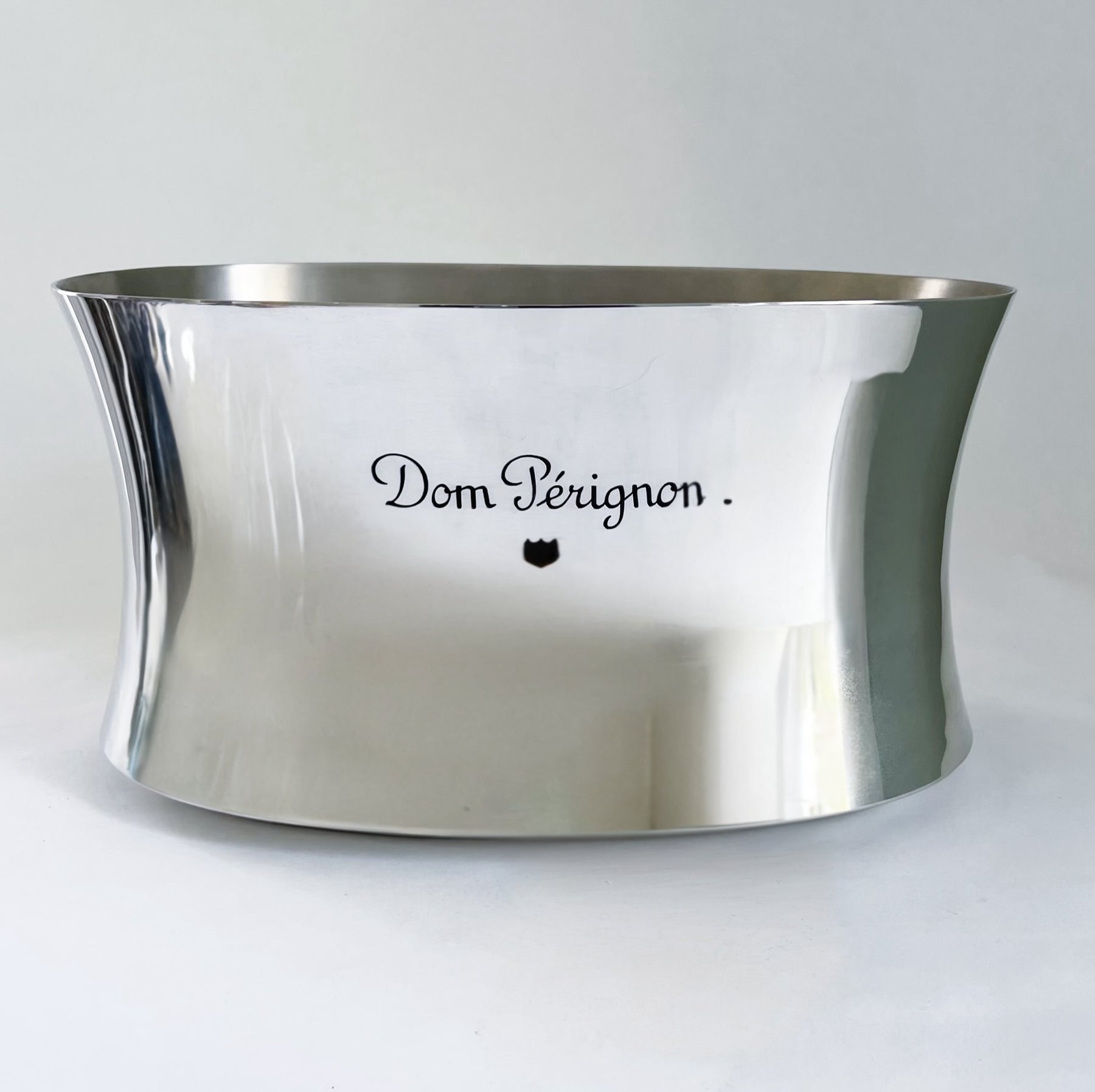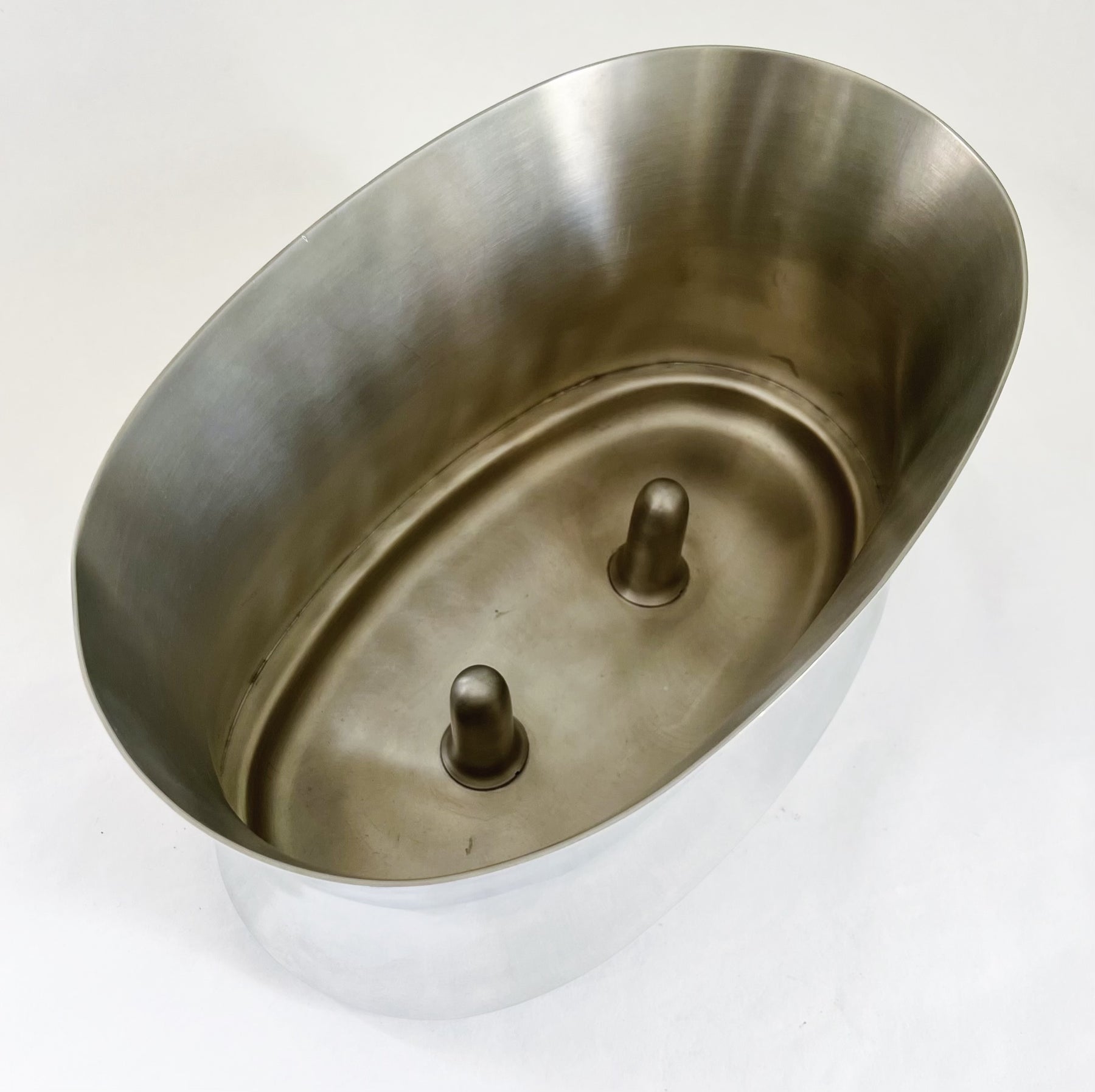 Elegant and rare French champagne cooler in tin from the champagne house Bollinger and stamped with "Les etains du Revelin" at the bottom. The cooler is from the 1950s-60s. The beautiful shape is inspired by the wooden baskets used for gathering grapes. The oval cooler has lovely ornamentation of grapes and leaves on the side. In good condition. Holds 2-3 champagne bottles.