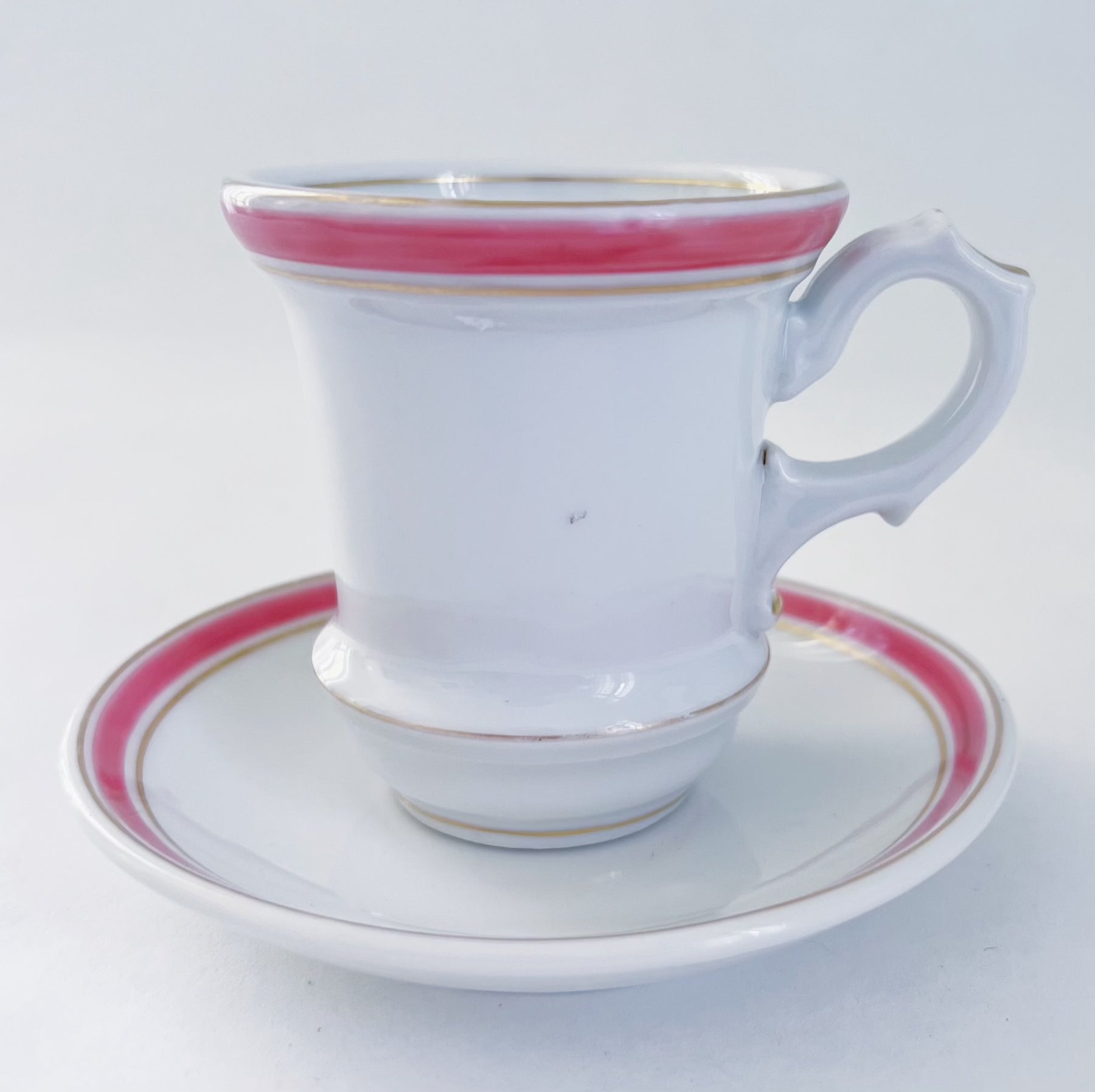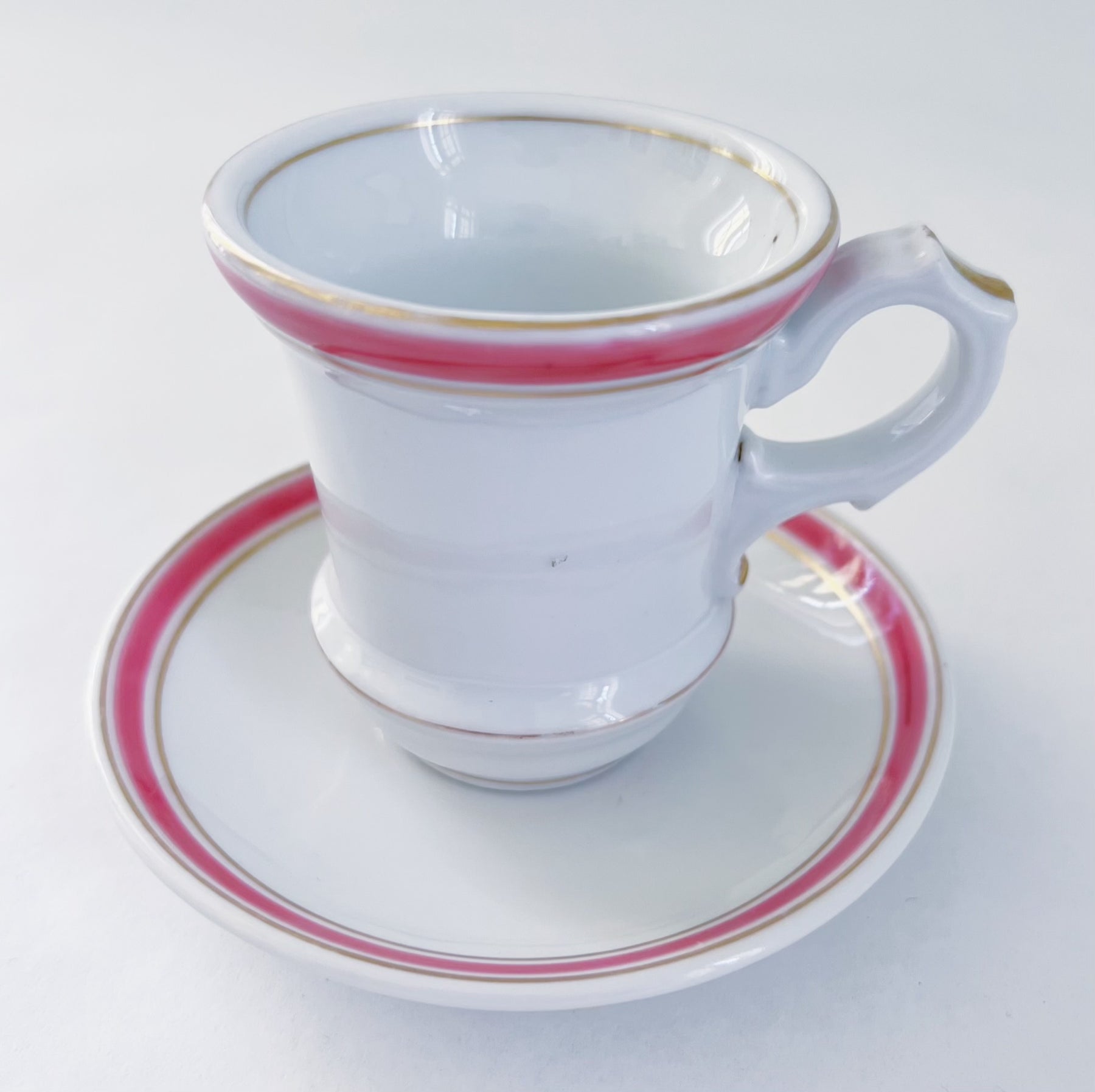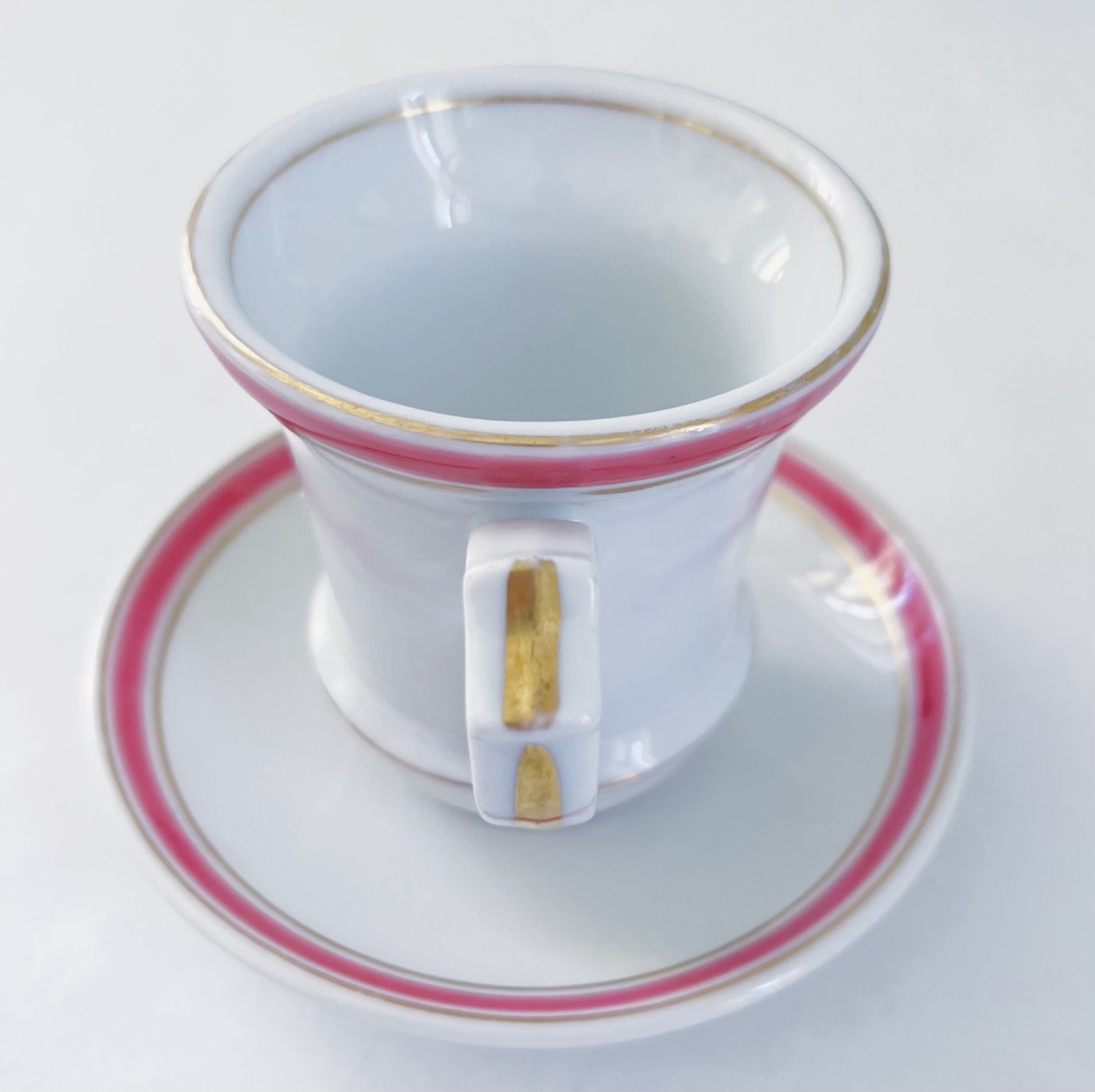 Lovely vintage Brûlot cup and saucer in quality solid porcelain, from France. When the French drank a cup of Brûlot, it was made with fresh black coffee, a couple of sugar lumps and lastly cognac, then ignited, and allowed to burn briefly.