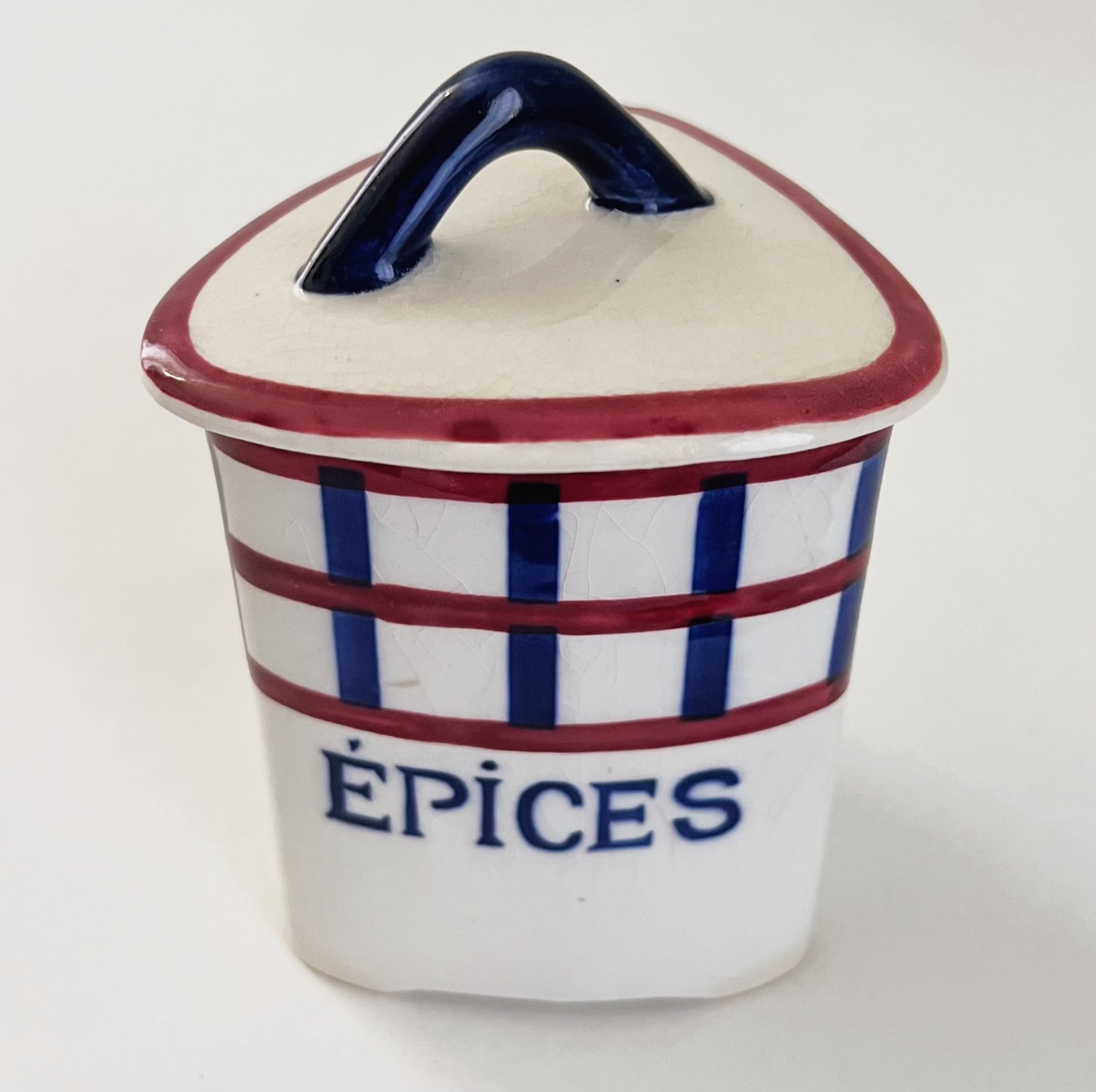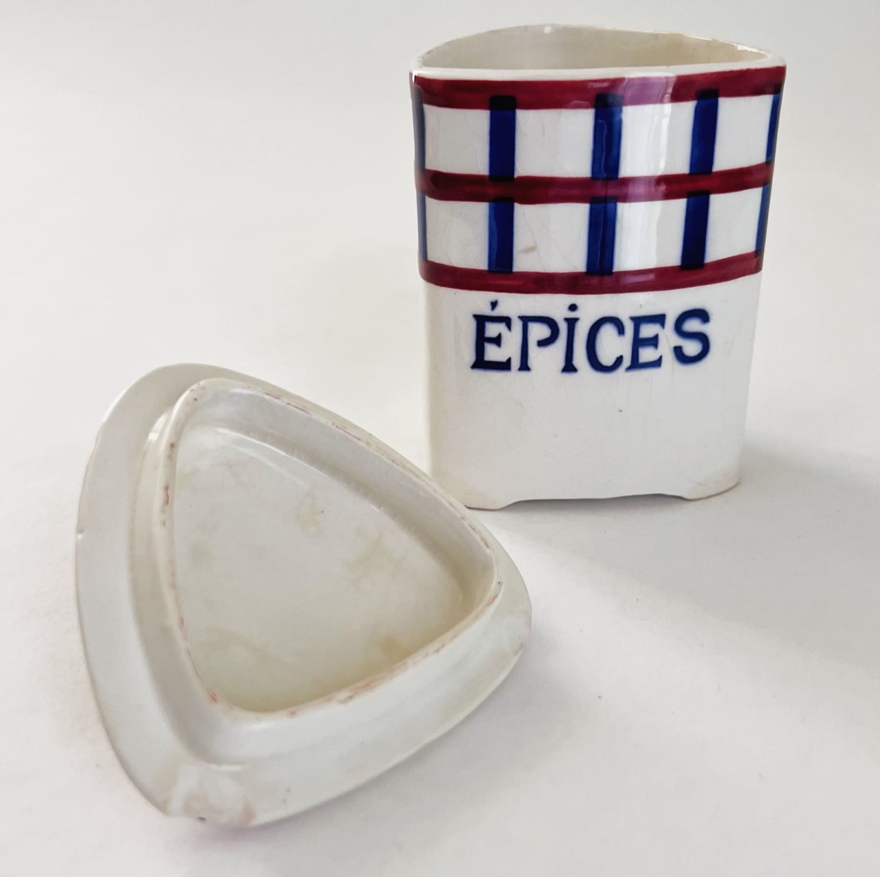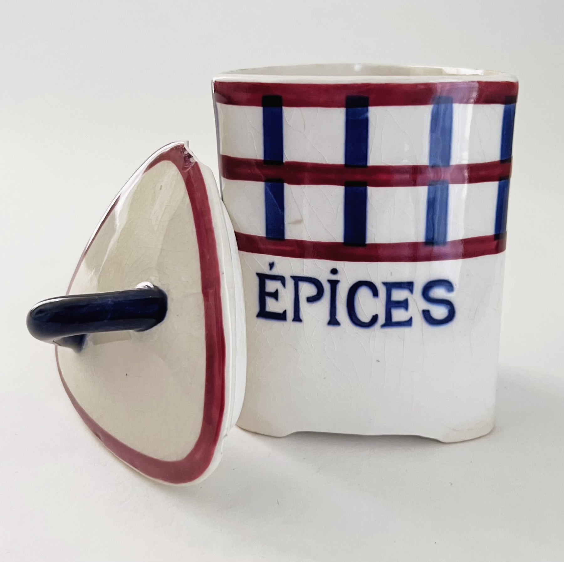 Beautiful smaller French spice jar (epices) from Hippolyte Boulanger Creil et Montereau. The model is called Bearn and is from the first half of the 1900s.