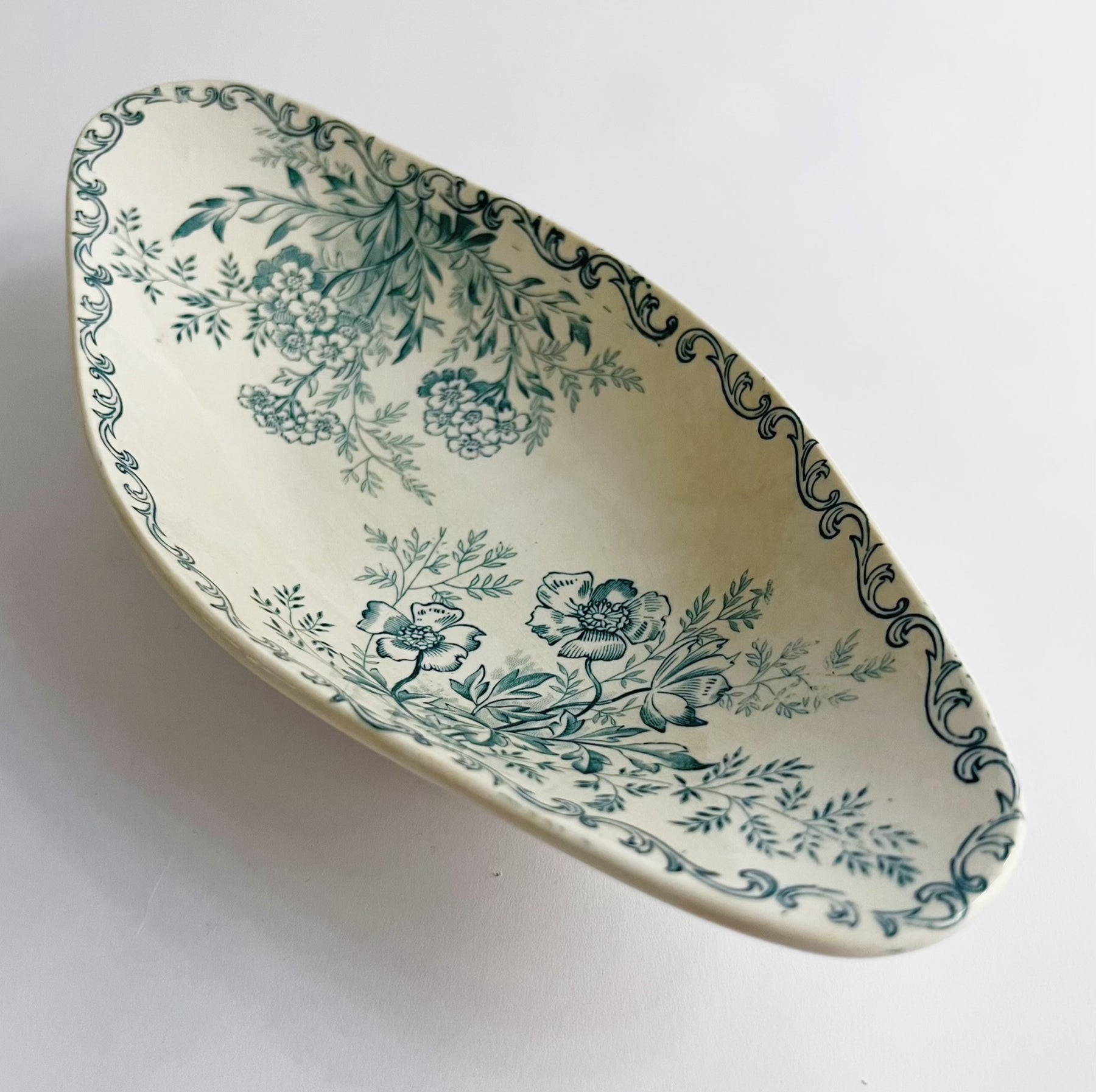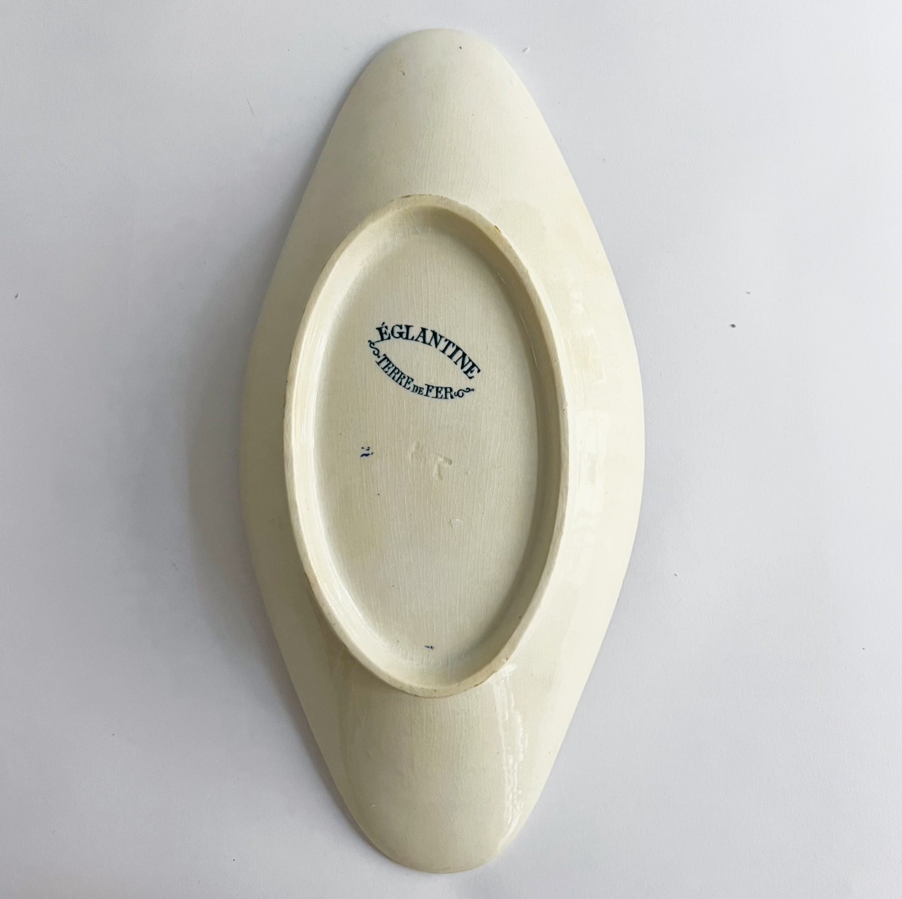 Lovely french oval serving dish from Sarreguemines. The model is named Eglantine and from the early 1900s. These oval dishes are often called Raviers in French and are the term for "a small dish to serve 'les hors-d'oeuvre". Perfect for serving snacks, olives, cookies on.