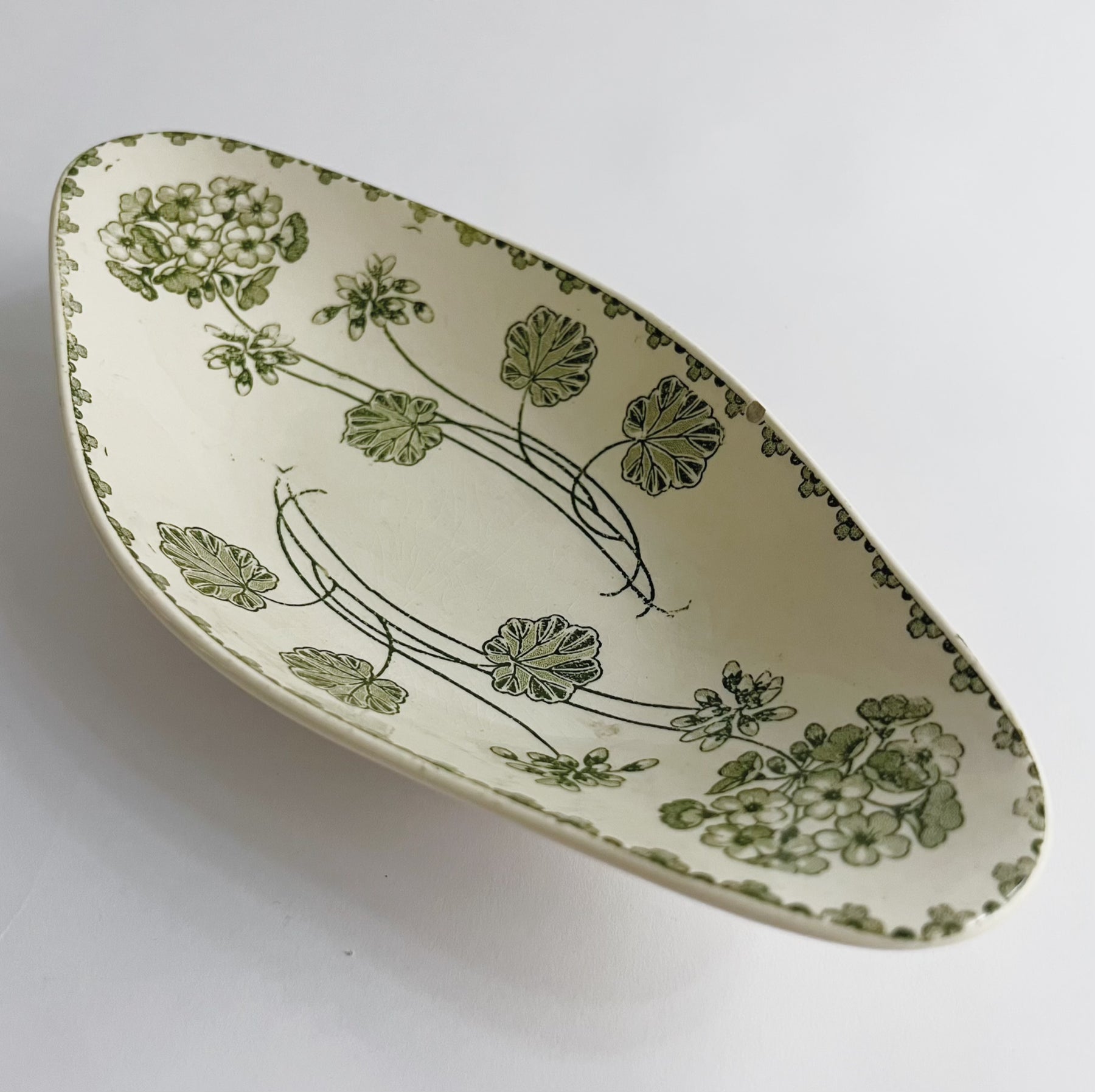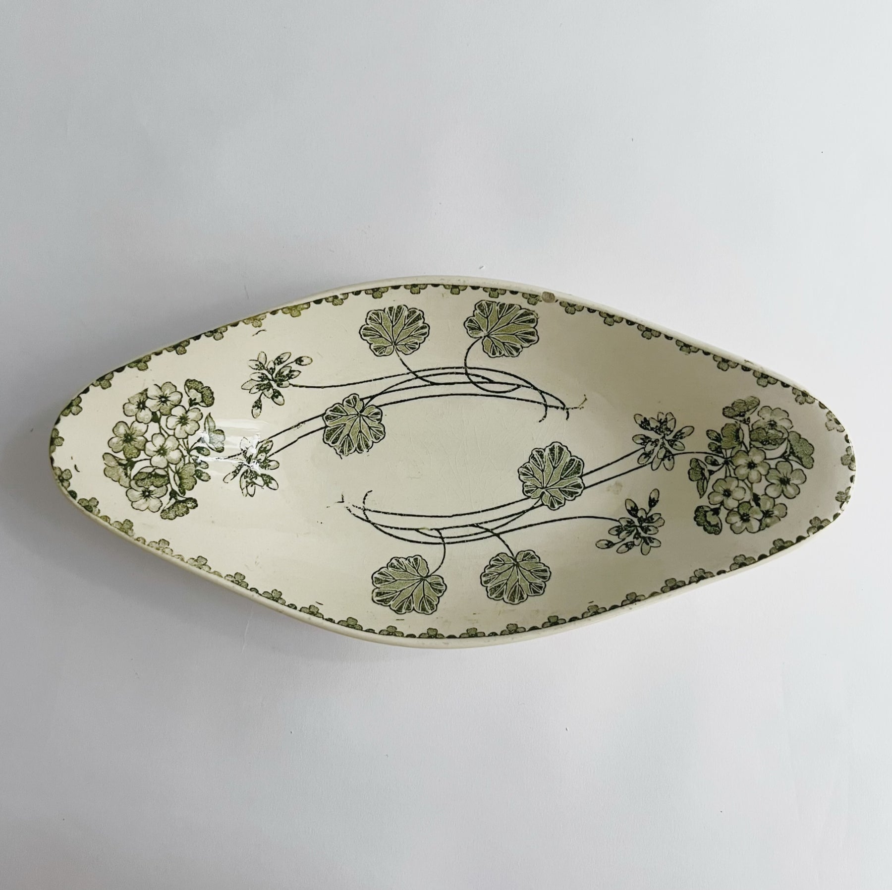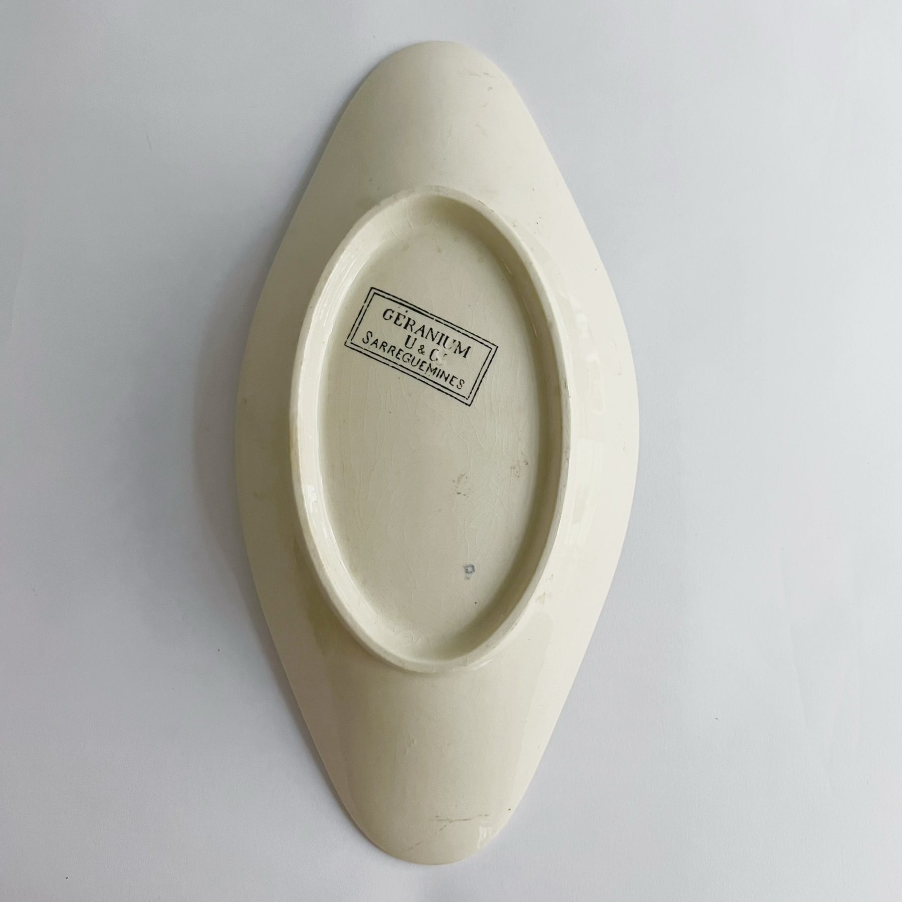 Lovely french oval serving dish from Sarreguemines. The model is named Geranium and from the early 1900s. These oval dishes are often called Raviers in French and are the term for "a small dish to serve 'les hors-d'oeuvre". Perfect for serving snacks, olives, cookies on.