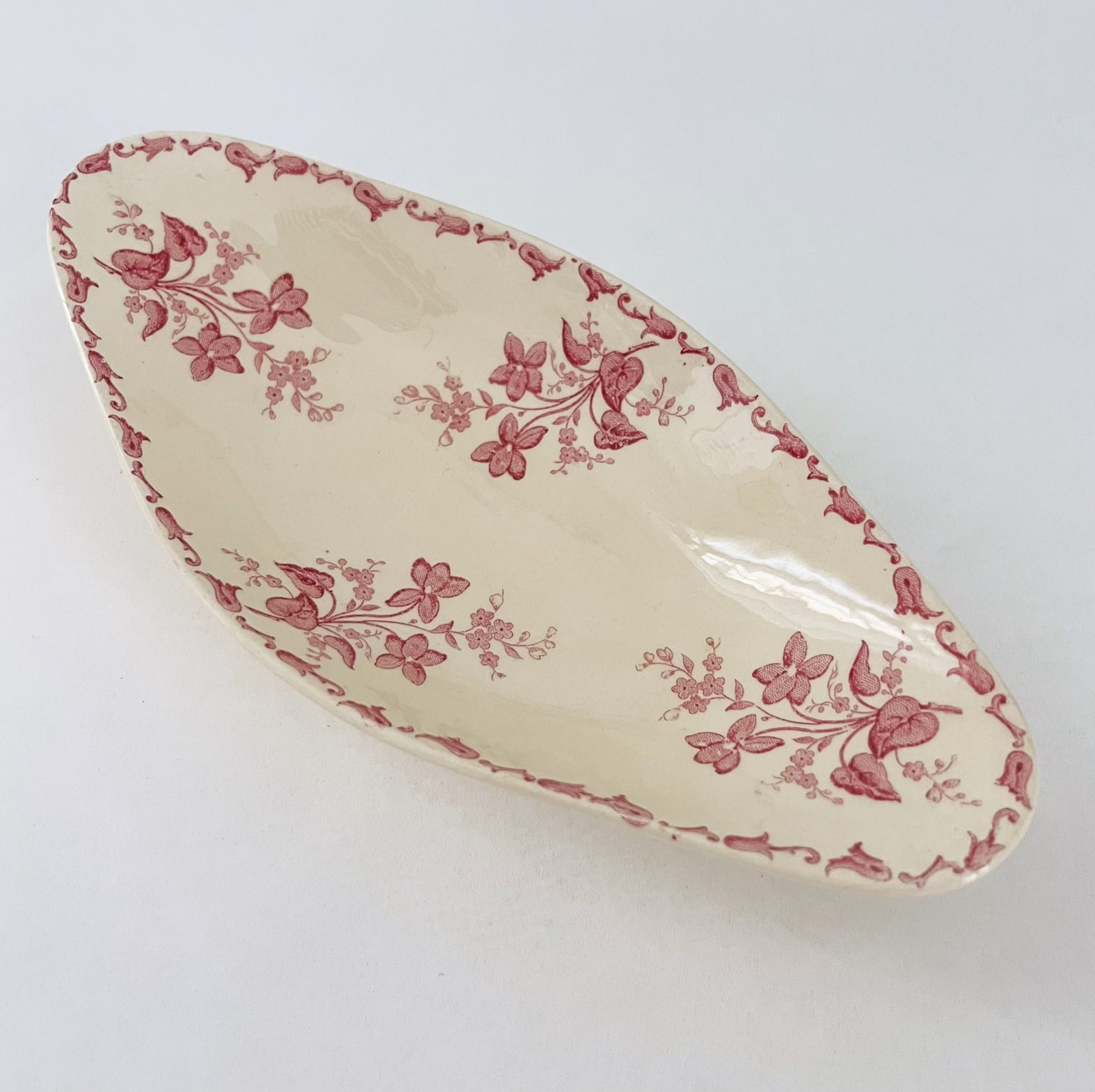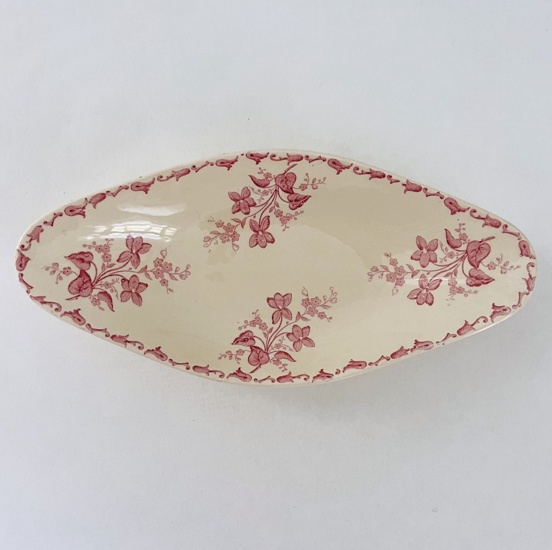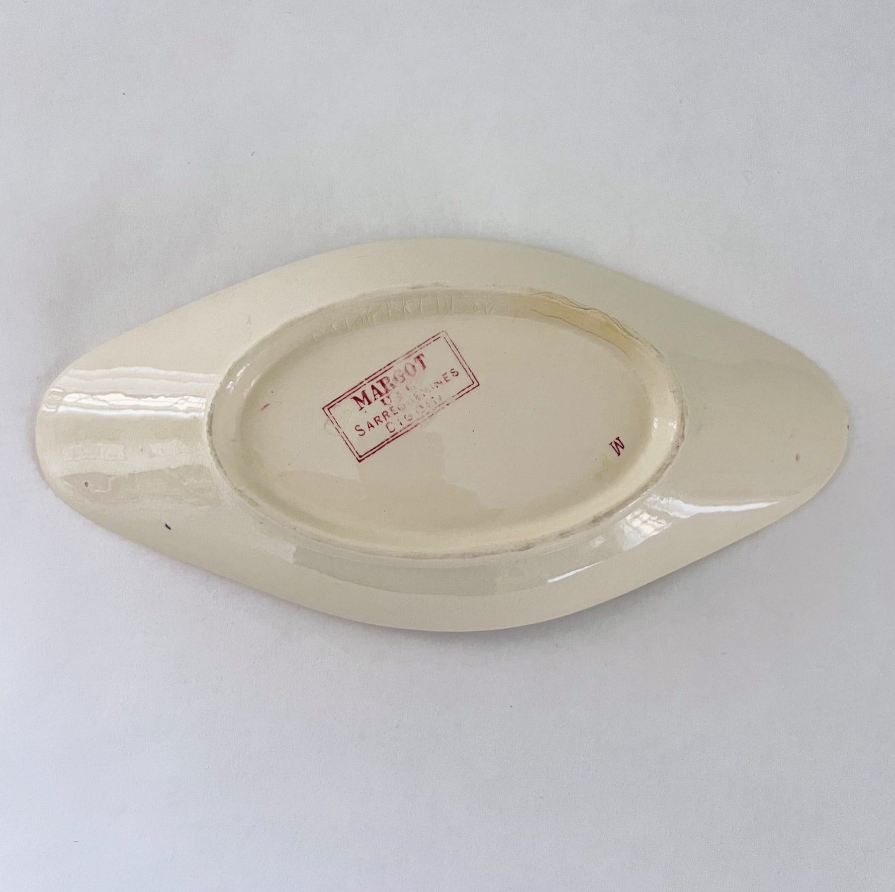 Lovely french oval serving dish from Sarreguemines. The model is named Margot and from the early 1900s. These oval dishes are often called Raviers in French and are the term for "a small dish to serve 'les hors-d'oeuvre". Perfect for serving snacks, olives, cookies on.