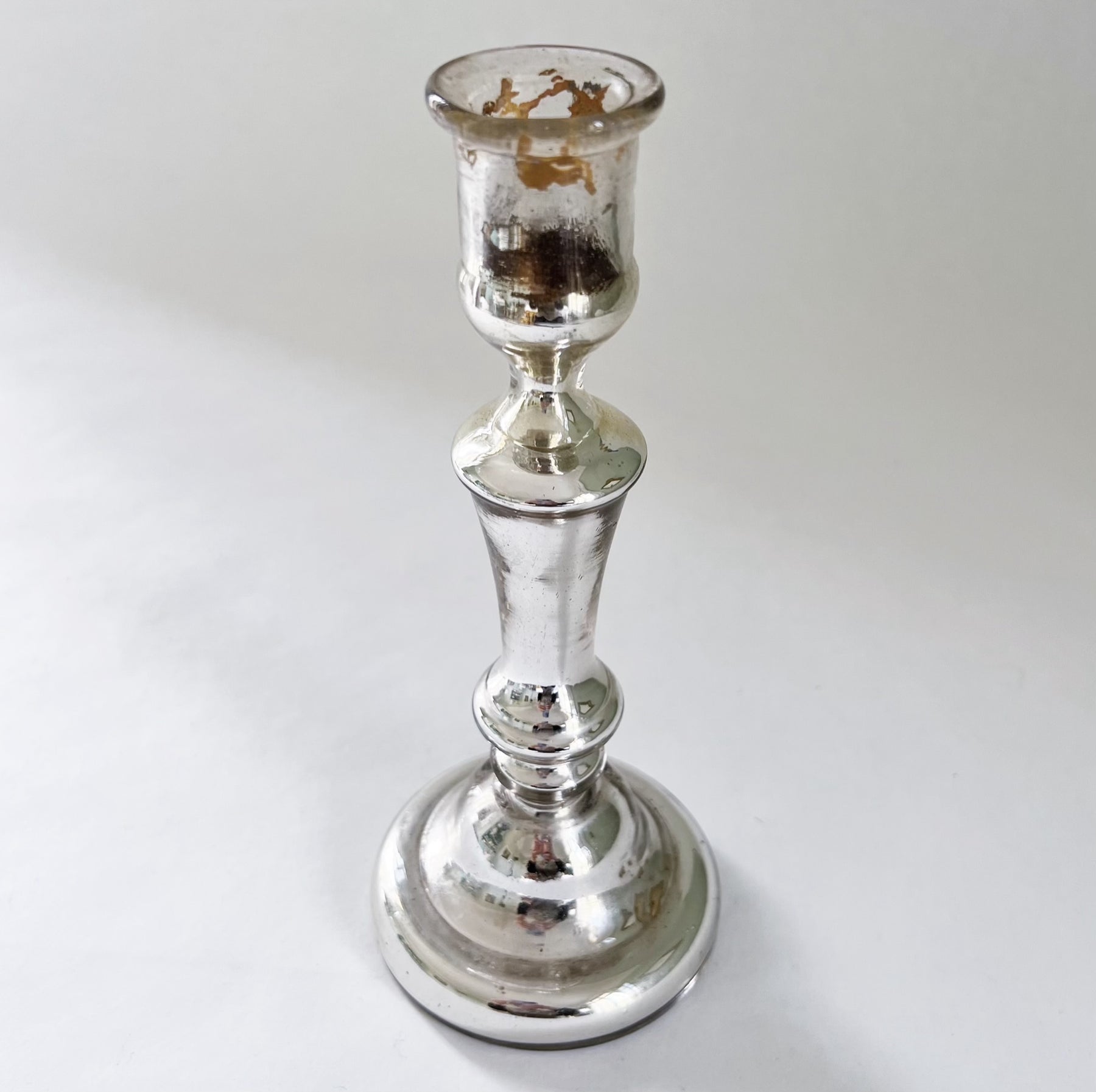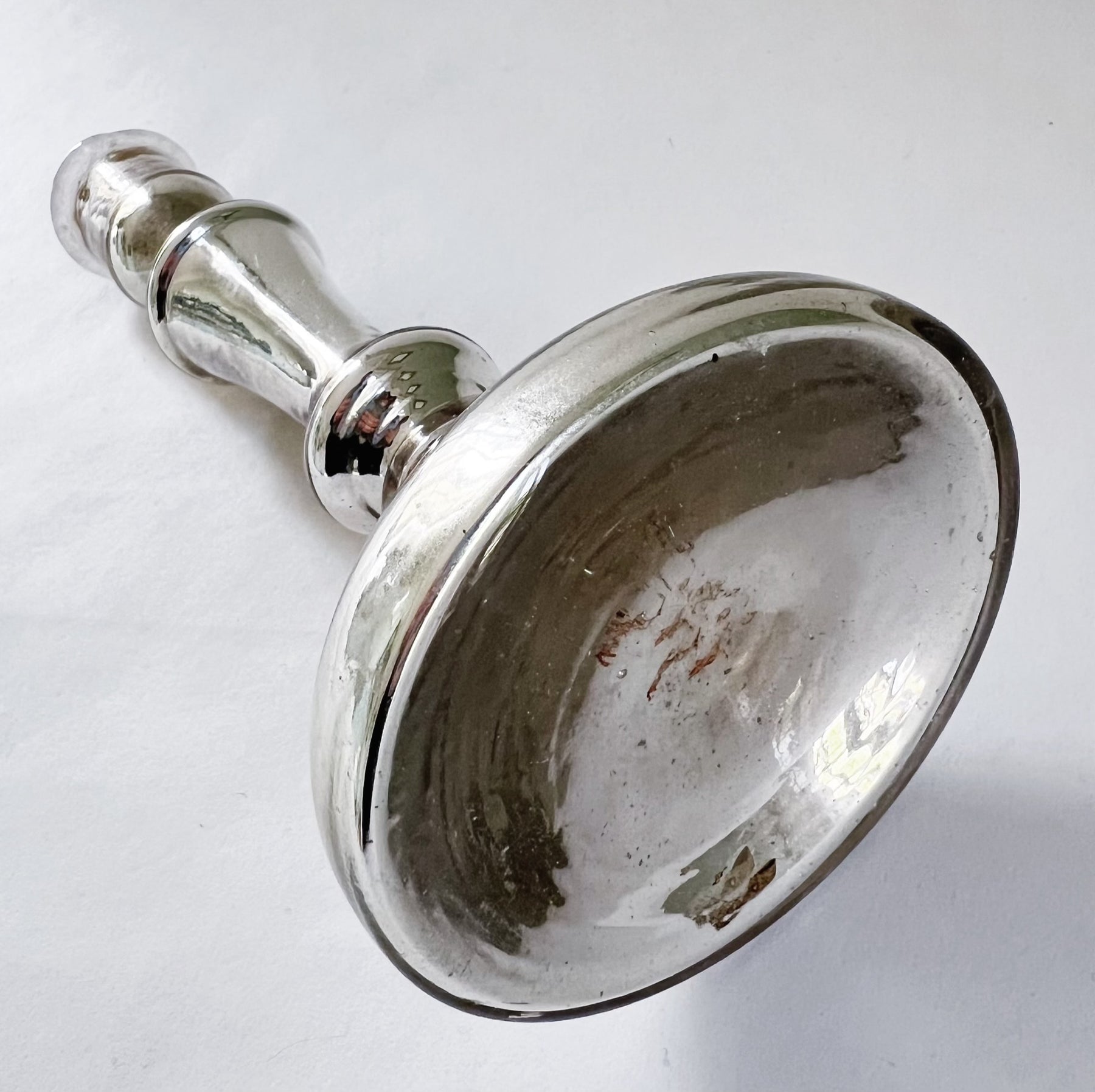Smuk antik fransk fattigmandsstage i mundblæst glas med indvendig kviksølvbelægning fra omkring år 1900. Fattigmandslysestager var den jævne mands alternativ til dyrt sølvtøj. Fattigmandssølv er i dag meget efterspurgt.